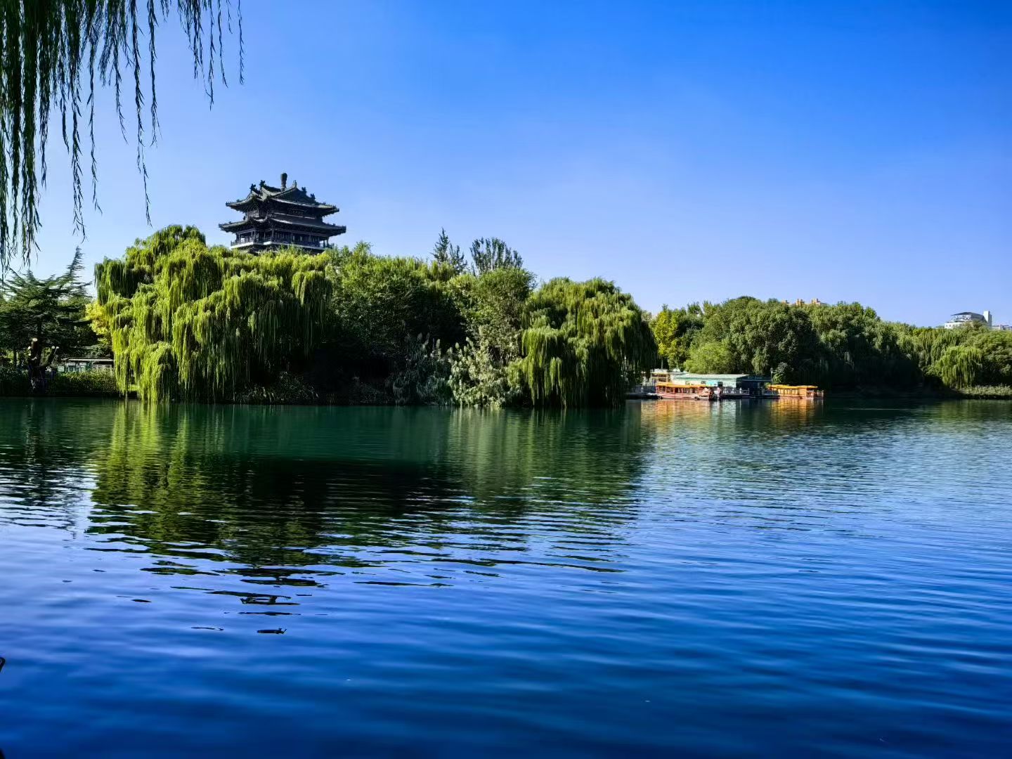 湖畔的垂柳,是最知趣的伴舞者。长长的枝条,已染上些许深浅不一的秋黄,却依旧柔软,随风款款地摇,依依地摆,像女子浣洗的长发,又像画家笔下灵动的线条,在空白的粉墙上勾勒出风的形状。湖中的画舫,悠悠地行着,红的栏,黄的檐,倒映在水里,影绰绰的,和真的搅在一起,虚虚实实,如梦似幻。船过处,拖出一条长长的清波,水纹慢慢地漾开,漾开,拍到岸边,化作细微的、几乎听不见的潺潺声,是这静谧天地里最温柔的絮语。