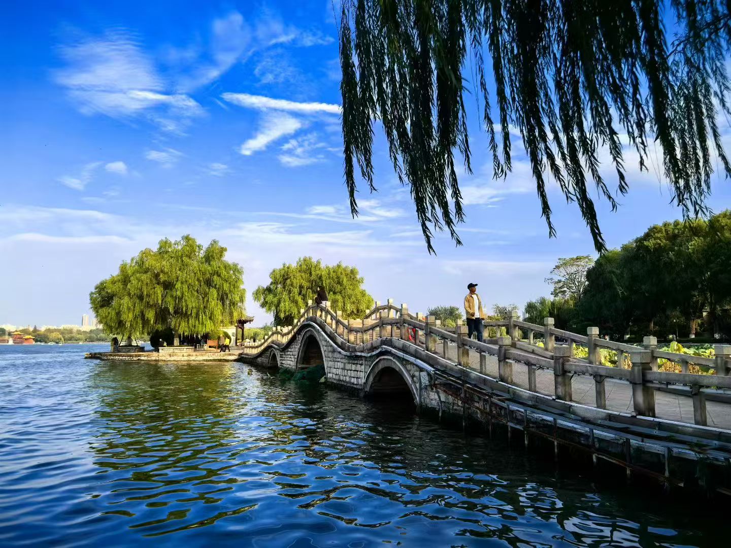 秋风拂面而来,不带一丝寒意,只有一种爽然的、透彻的清凉,像最上等的丝绸滑过肌肤。游人的笑语,从远处、近处,三三两两地传来,也是清亮的,愉快的,融在这空气里,并不觉得嘈杂,反倒给这静美的画卷添上了几分人间的、温暖的生气。