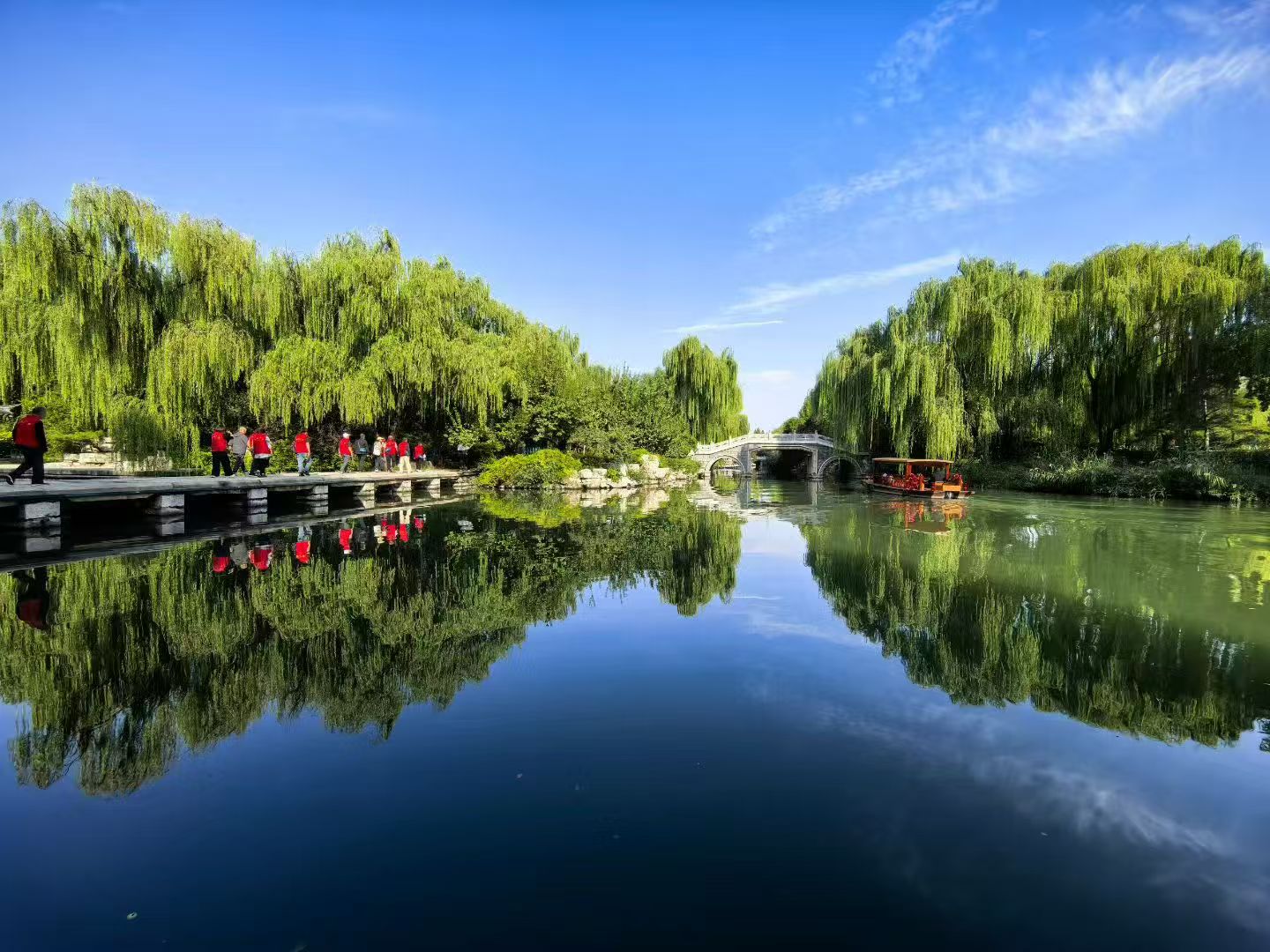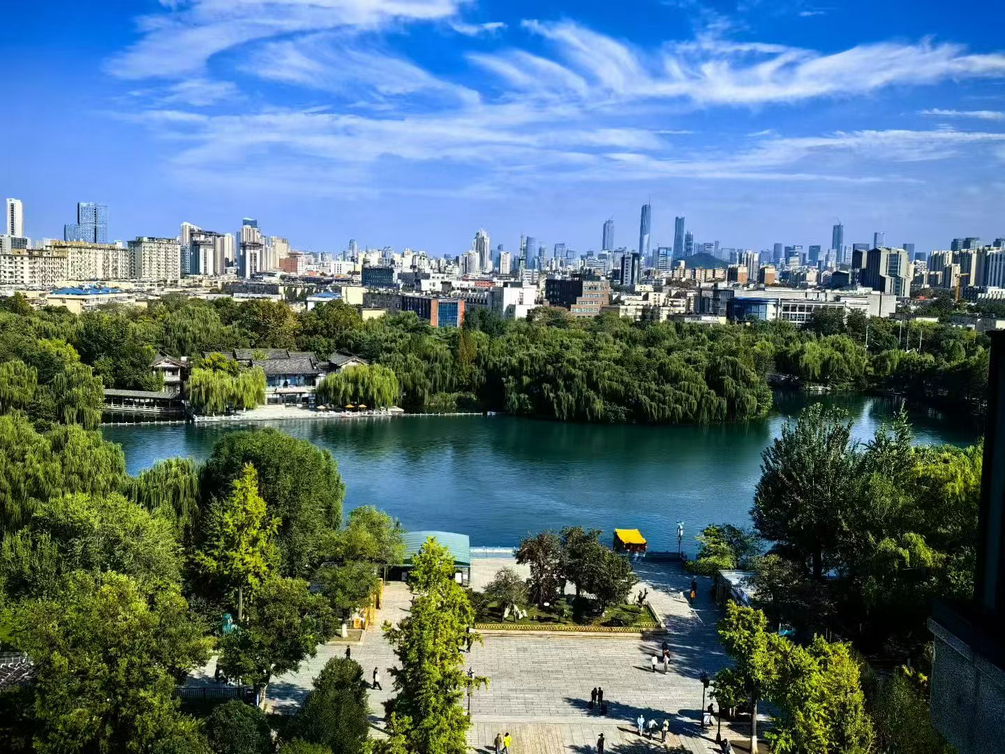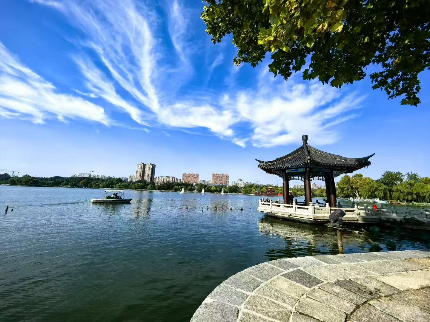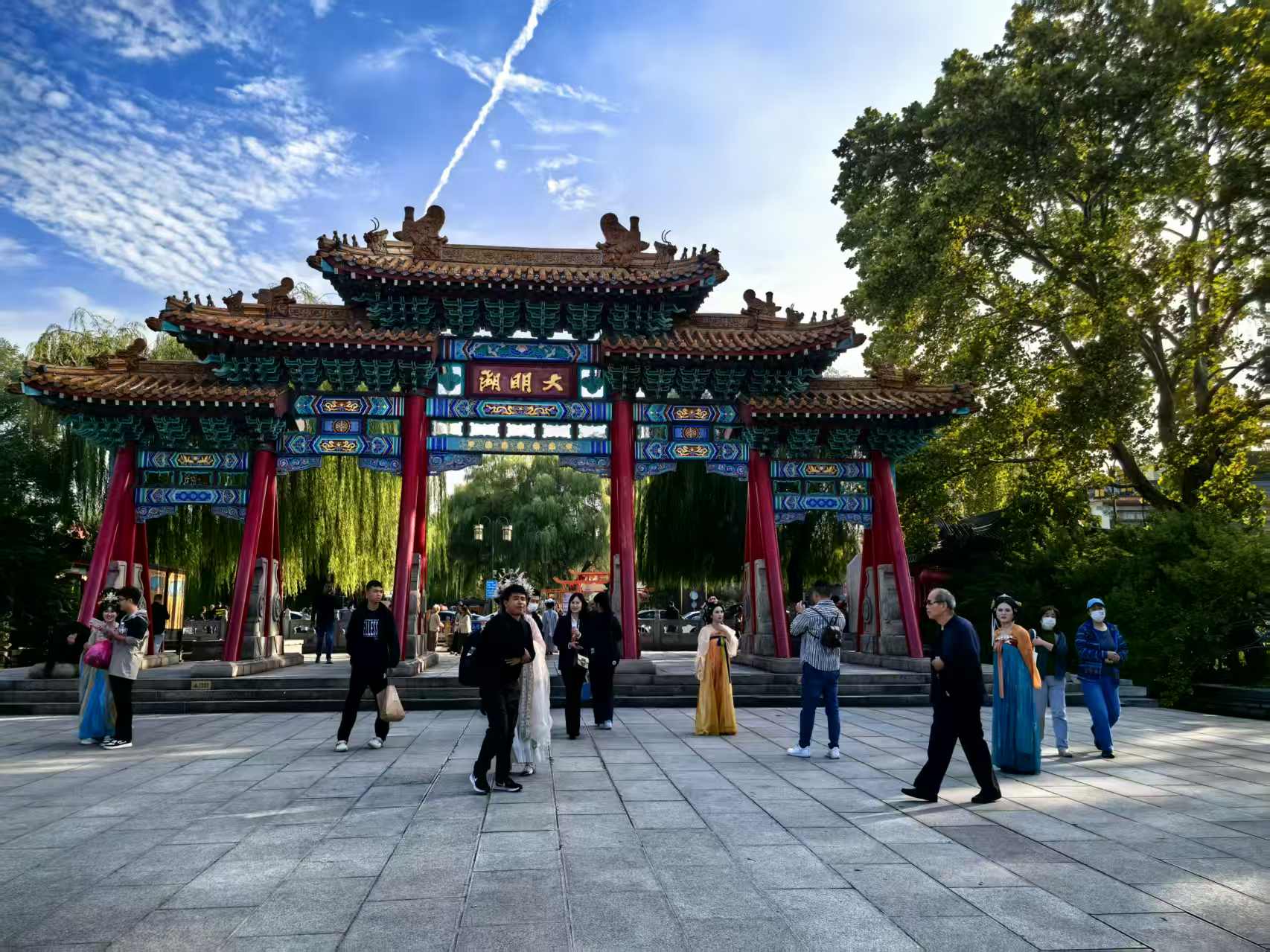 于是,赶忙收拾利落下楼遛弯,随手拍了些许照片。午饭后,顺手发了个朋友圈,并配文:大济南今天终于睁眼了,真不容易啊!老天爷阴阳八卦地耍懒,梨花带水地哽咽哭泣了半月之久,今儿终于幡然醒悟——再继续这样四六不通地抽泣躺平,秋香姑娘可真就逃之夭夭咧。老同事陈主任留言:“预报明儿晚上接着下,不能高兴太早。”“嗬!我去。”回复完信息,立马收拾一番,走!去大明湖透透气儿。