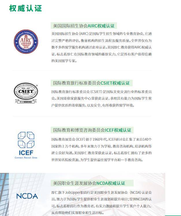 厚仁教育专注于为留学生提供全方位的求职规划。厚仁求职秉持“学业的终点是就业”的服务理念,基于在美企业及高校资源优势,通过高校科研、企业实训、社会服务实践、职能提升,培养学生掌握职场必备技能,致胜未来学术和职场发展。厚仁求职拥有200+ 美国本土企业资源;TOP50顶级院校科研资源,为留学生提供合法正规的校外专业实践机会。厚仁教育是美国职业生涯发展协会(NCDA)认证会员,致力于为国际学生提供职业生涯规划和提升项目。