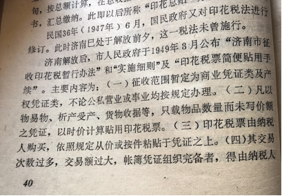 民国37年是1948年,济南解放是1948年9月24日,也就是说,该账簿设立时,济南仍属国民党政府管理。账簿类印花税一般按年纳税,因此,这两类印花税票的贴制时间应该分别为1948年和1949年。如此,民国类两种印花税票贴制时间应为1948年初,适用的是国民政府1946年修订公布的印花税法;解放区印花税票的贴制时间应为1949年,但具体时间却有许多值得探讨之处。