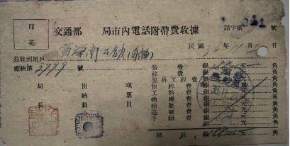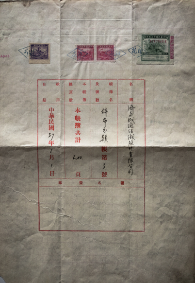 账折上贴有四枚两类三种印花税票。一类是山东解放区“工厂图”印花税票,一类中华民国联运图印花税票。面额分别是50元、1000元、20000元。民国“联运图”印花税票,红1000元为1947年1月中央印制厂北平厂印制;绿20000元为1948年中央印制厂上海厂印制。紫50元山东解放区“工厂图”印花税票,从目前资料看,均为1947年印制,但具体印制时间及地点不清,当时共印制“有齿与线齿”两种,此枚为“线齿”。