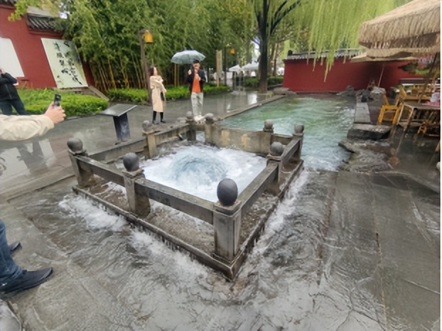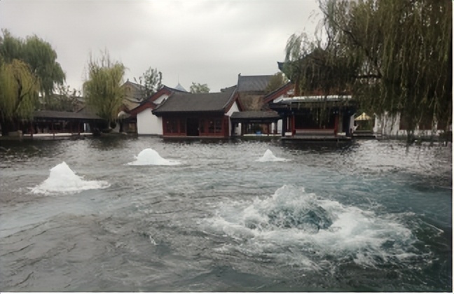 百脉泉群雨中喷涌,如串串珍珠跃出水面,其中墨泉的声势最为浩大。黝黑的泉孔喷出尺余高的水柱,闷雷般的轰鸣穿透雨幕,引得游客纷纷驻足拍照。这眼“一泉成河”的名泉在雨中更显磅礴,喷出的泉水溢出泉池四壁,充满整个河道,石栏泉池与墨色泉水构成一幅天然水墨画,让人想起李清照笔下“水通南国三千里,气压江城十四州”的壮阔。而金镜泉则另有一番风致,圆形的泉池倒映着灰蒙蒙的天空,雨点落下时,池面金辉闪烁如打翻的琉璃盏,难怪古人称其“水面如镜,金辉闪烁”。
