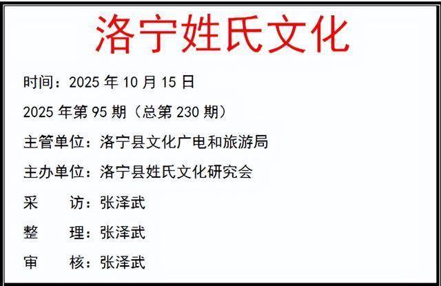 作者简介:张泽武,洛宁县陈吴乡新寨村人,2003年,发起并成功组织成立了洛宁县姓氏文化研究会,担任常务副会长兼秘书长一职,2006年参与组织筹备成立洛阳市姓氏文化研究会,任副秘书长。2017年被推举为洛宁县姓氏文化研究会会长。2024年8月再次当选为洛宁县姓氏文化研究会会长。