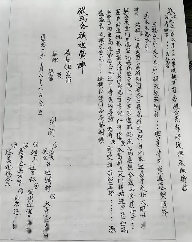 ③据清咸丰三年三月,十七世孙捷科、殿拔《建筑祠堂碑记》记载:“吾族与洛河南德里村张氏系分两门,原籍陕西省同州府大荔县东雁羗村,由元末避兵於此,延绵至捷已十七世。”