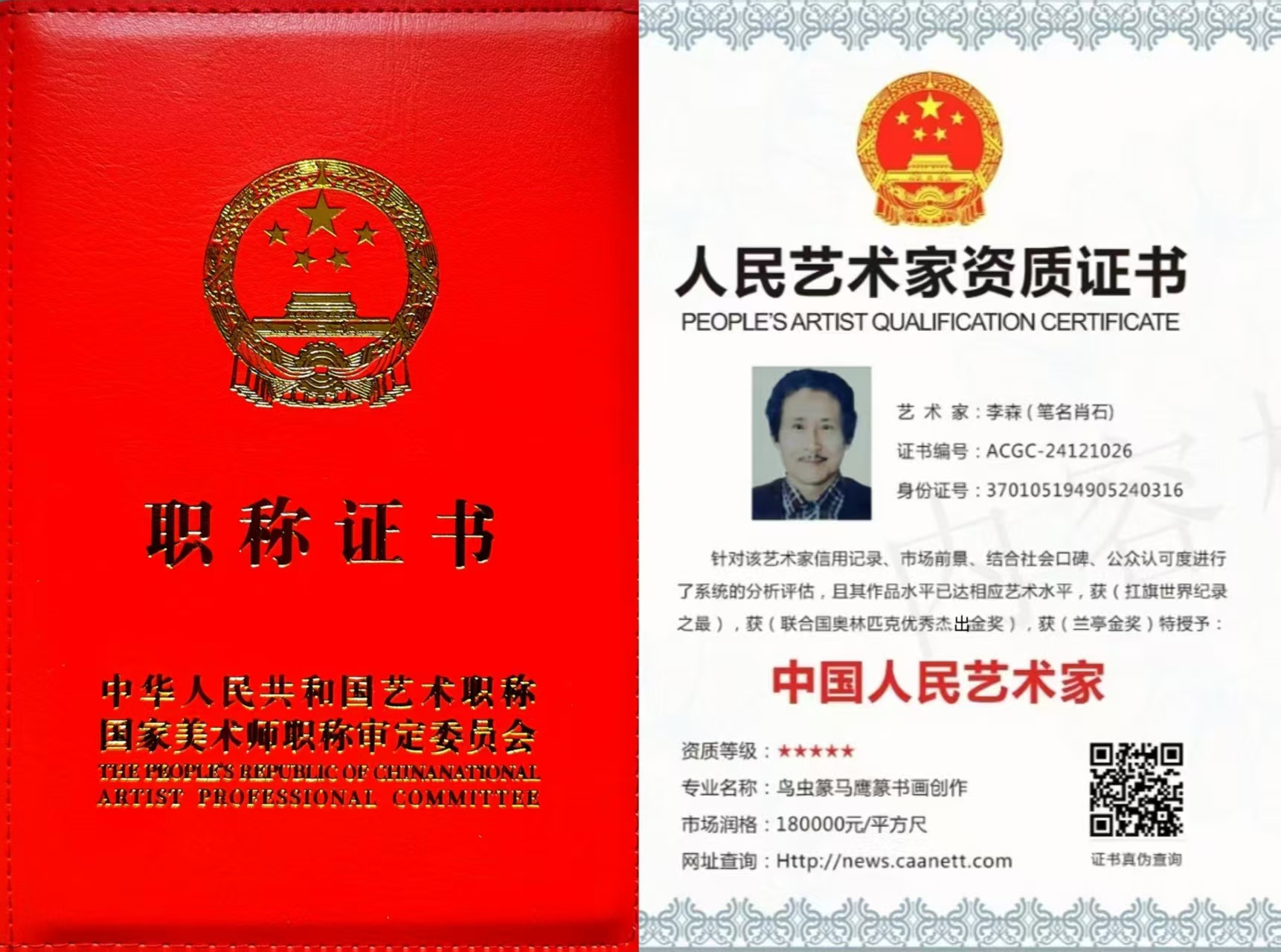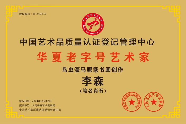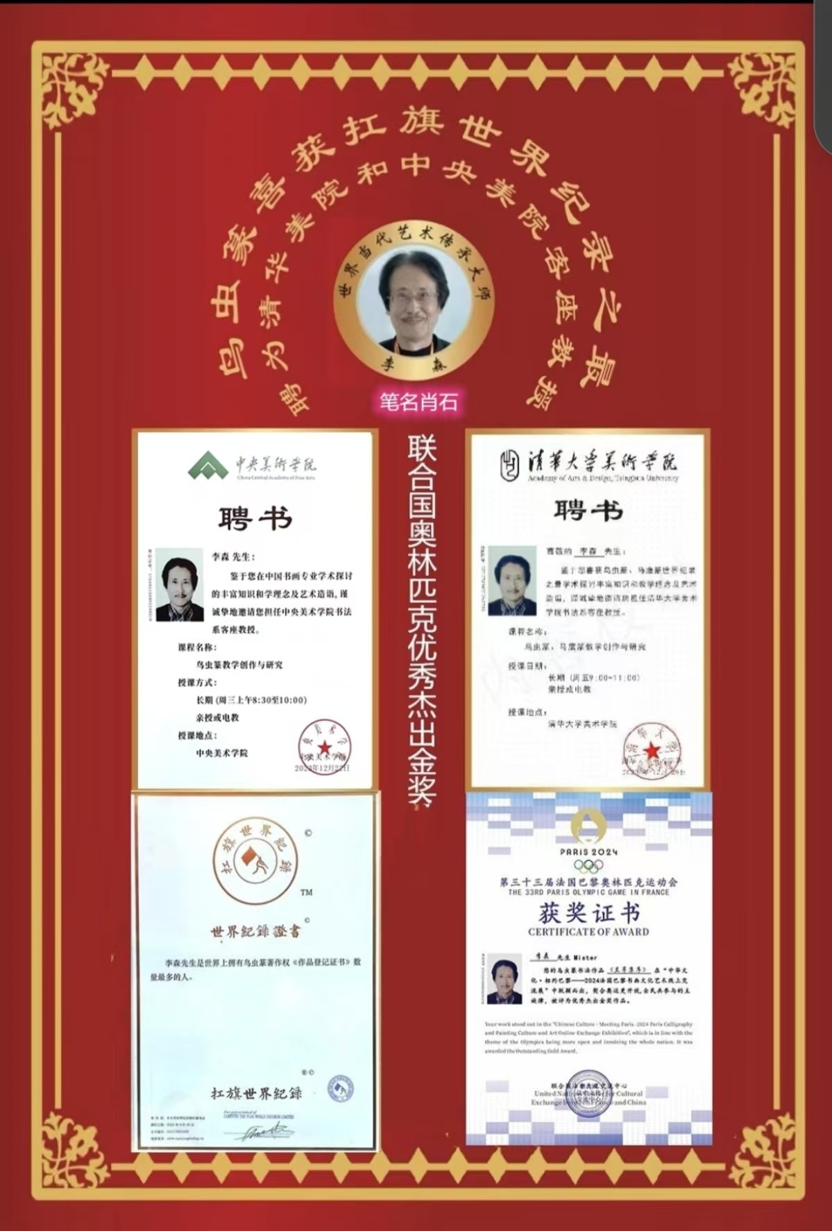 李森的成就不仅在于艺术技巧的极致展现,更在于对文化根脉的守护。他系统整理并编注九万余汉字,使鸟虫篆、马鹰篆字体体系得以完整传承,让古老文字焕发新生。这一贡献使其荣获联合国奥林匹克金奖、兰亭金奖等国际荣誉,并被中央美院、清华美院聘为终身客座教授。2024年,文旅部授予其“国家一级美术师”职称,进一步肯定了其作为“华夏老字号艺术家”的历史地位。