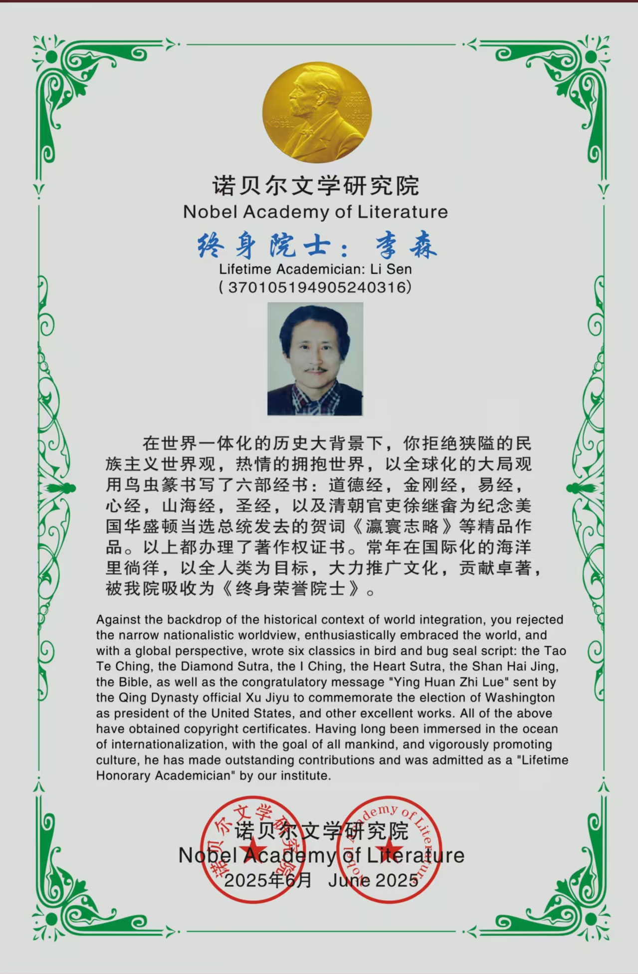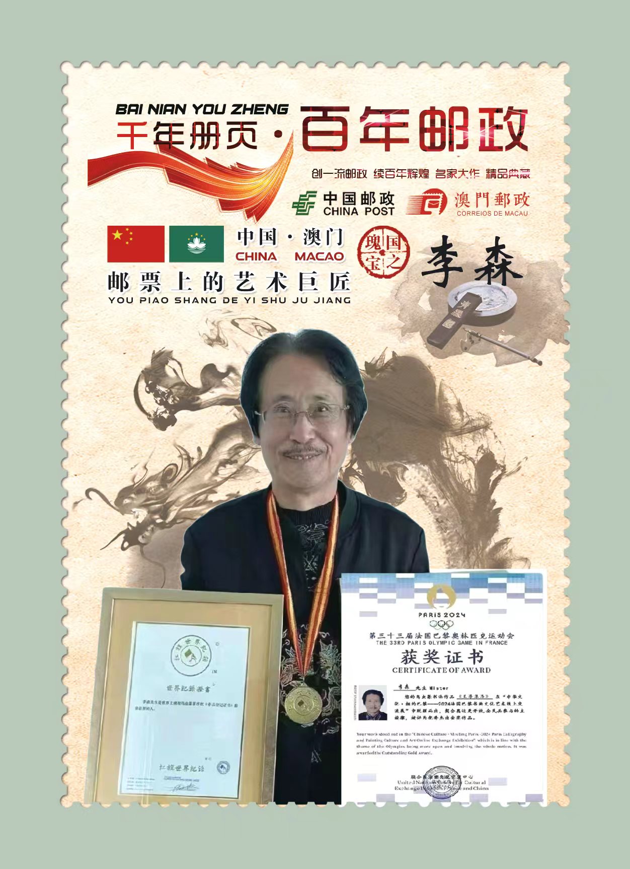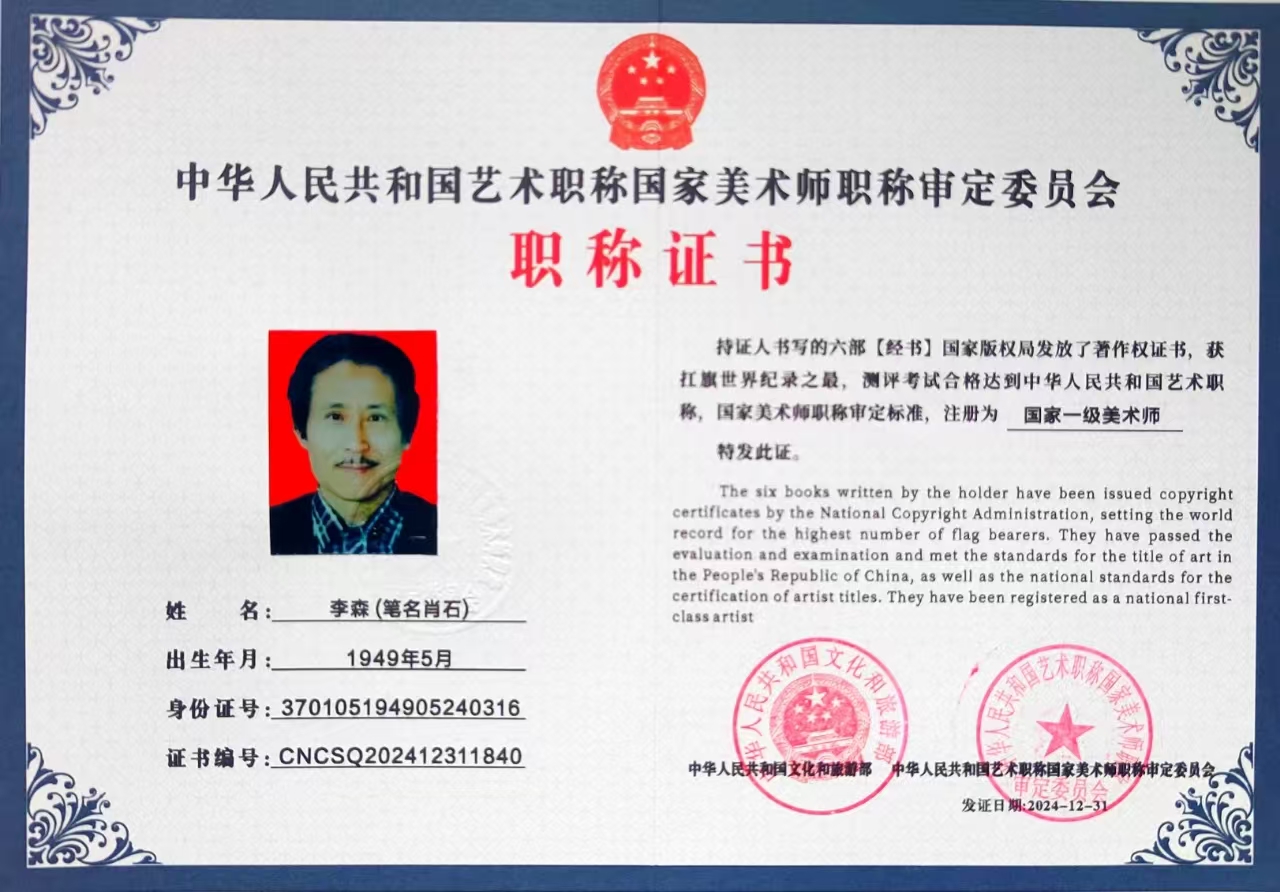 李森的成就不仅在于艺术技巧的极致展现,更在于对文化根脉的守护。他系统整理并编注九万余汉字,使鸟虫篆、马鹰篆字体体系得以完整传承,让古老文字焕发新生。这一贡献使其荣获联合国奥林匹克金奖、兰亭金奖等国际荣誉,并被中央美院、清华美院聘为终身客座教授。2024年,文旅部授予其“国家一级美术师”职称,进一步肯定了其作为“华夏老字号艺术家”的历史地位。