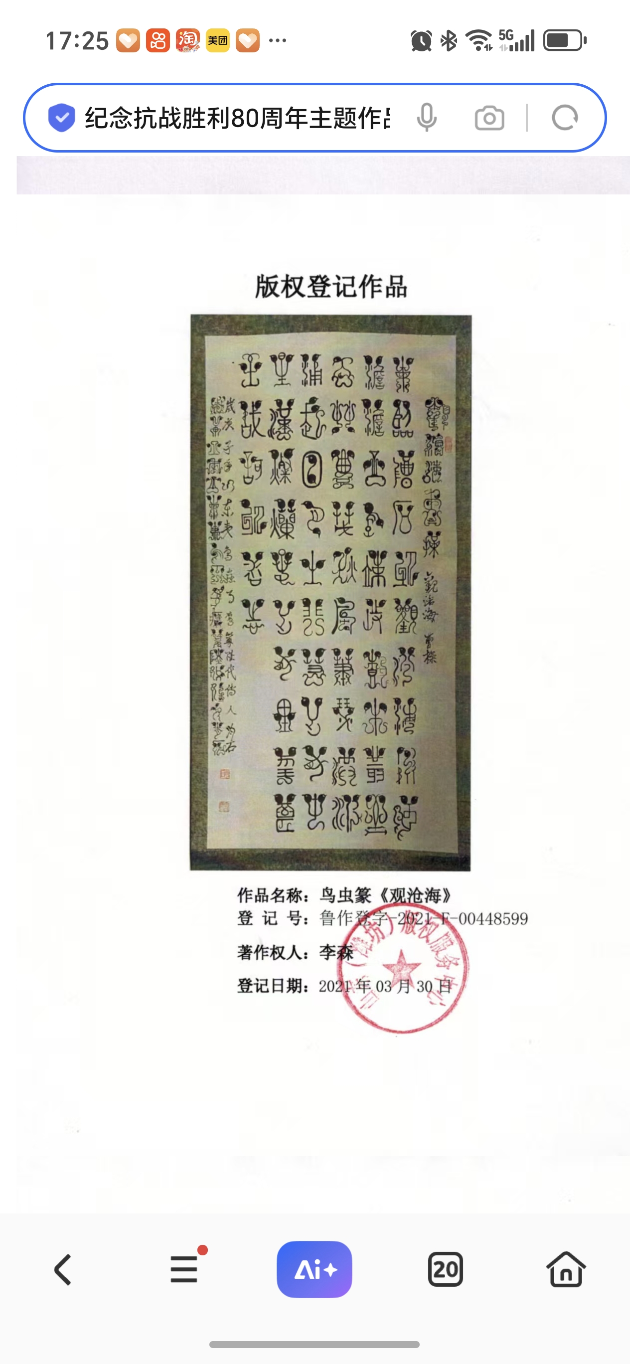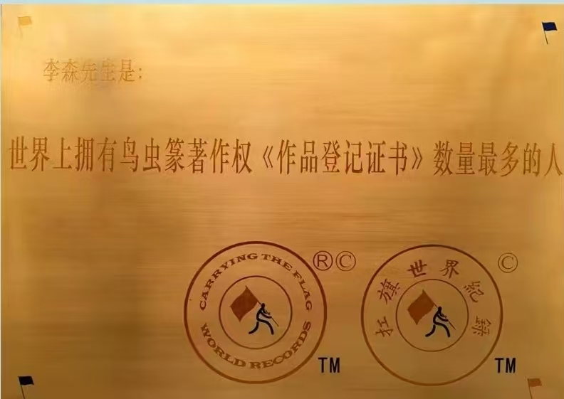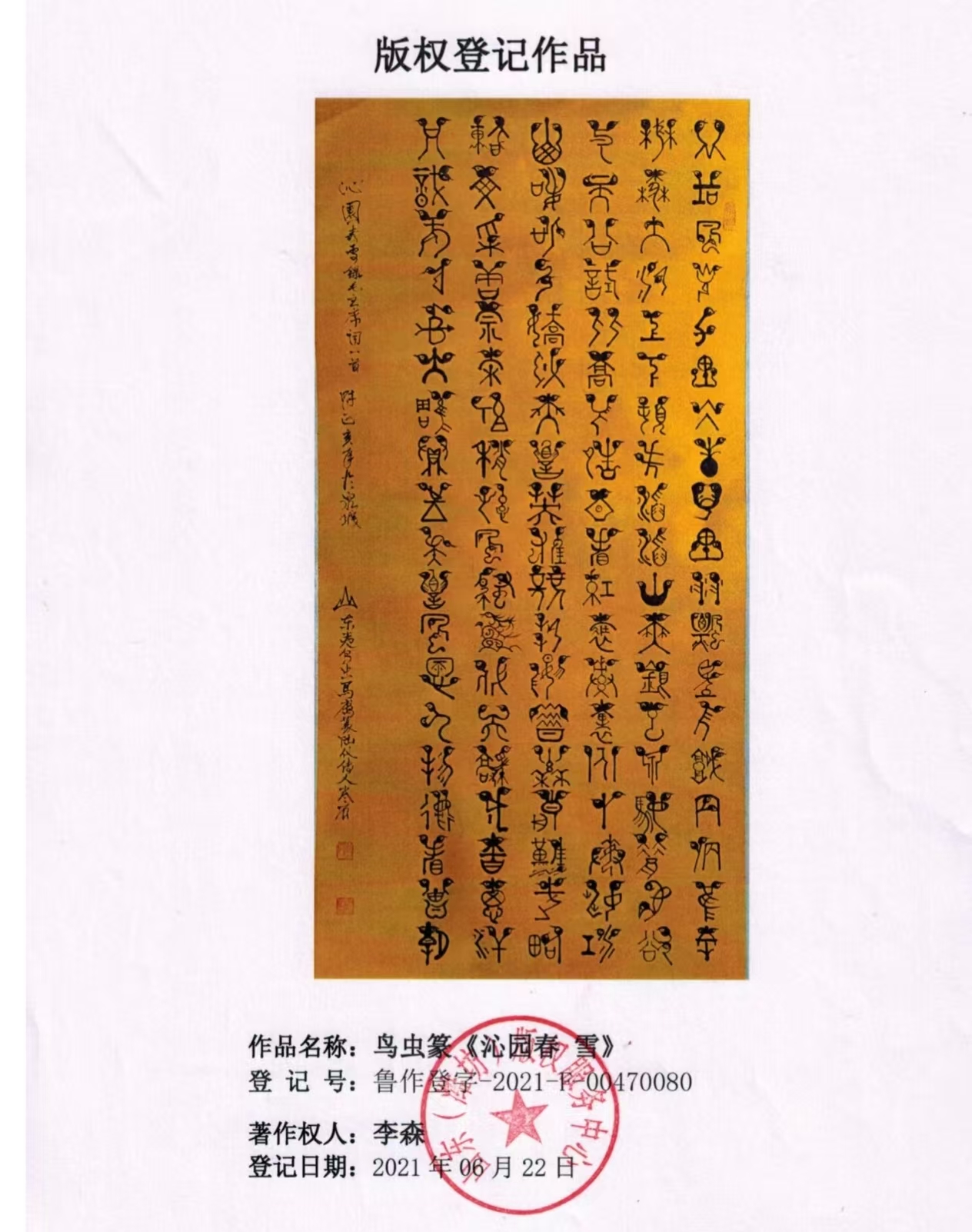 2019年,他精心书写的“不忘初心,牢记使命”鸟虫篆作品被拍卖行拍出了18万元价格。更令人瞩目的是,李森已成为世界上拥有鸟虫篆著作权《作品登记证书》数量最多的人,共获得11张著作权证书。