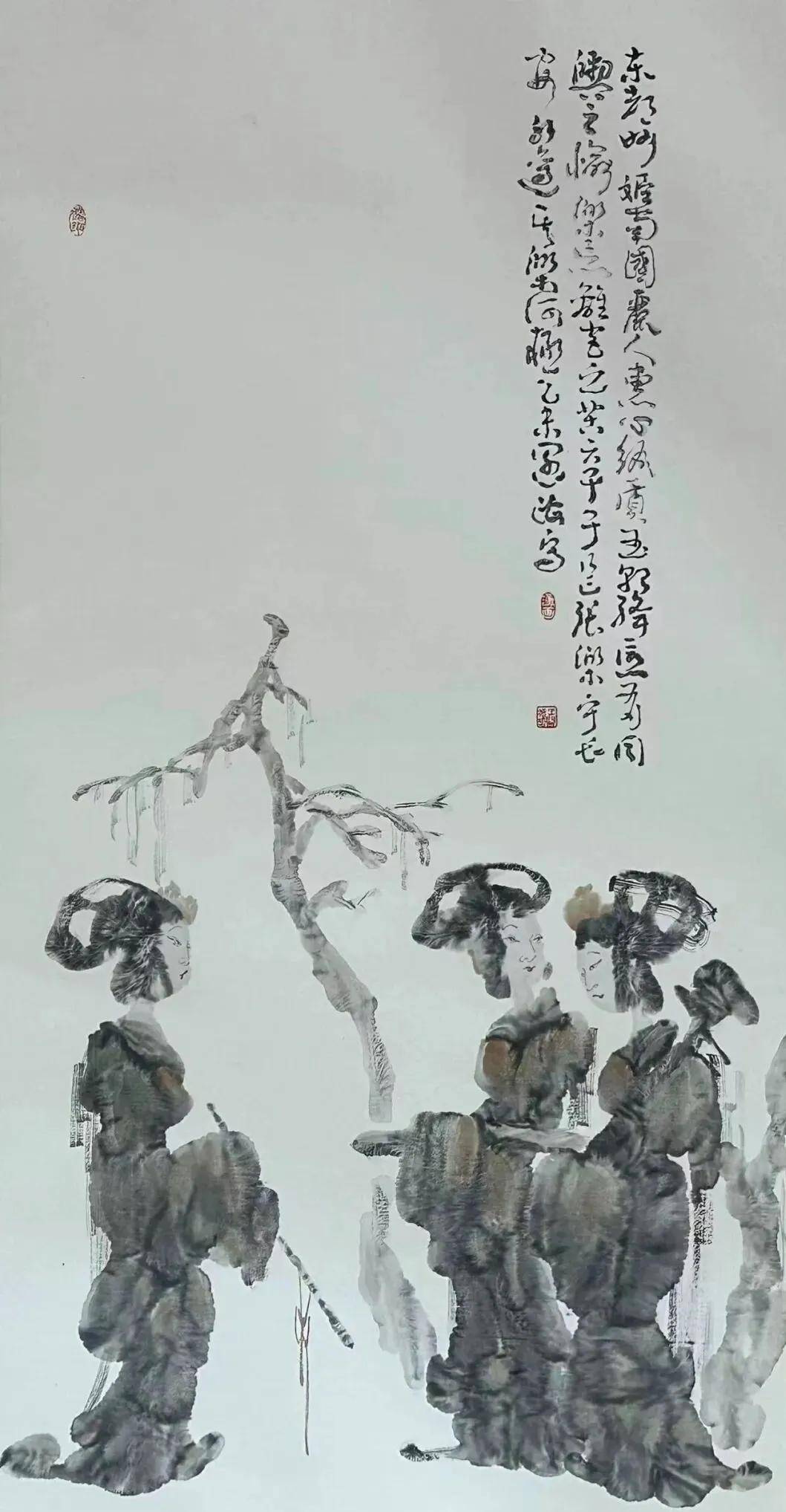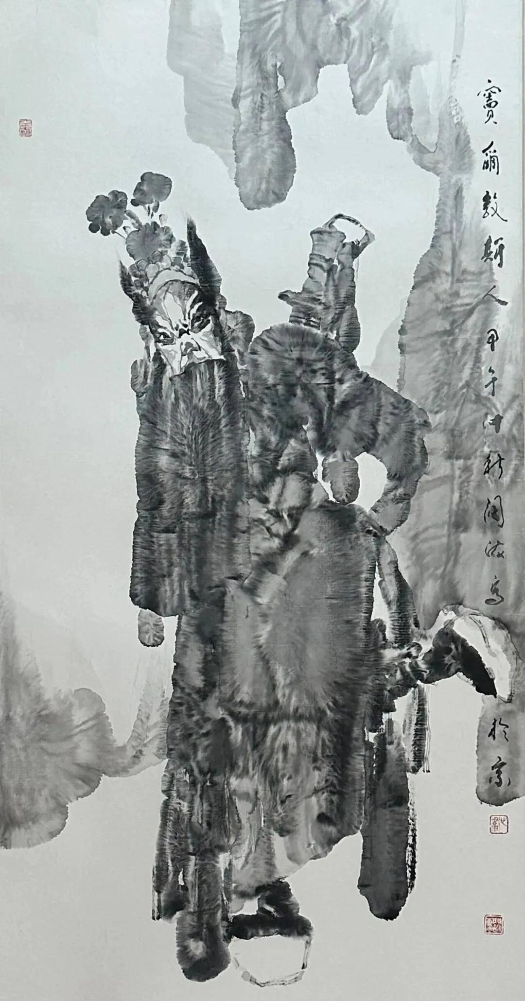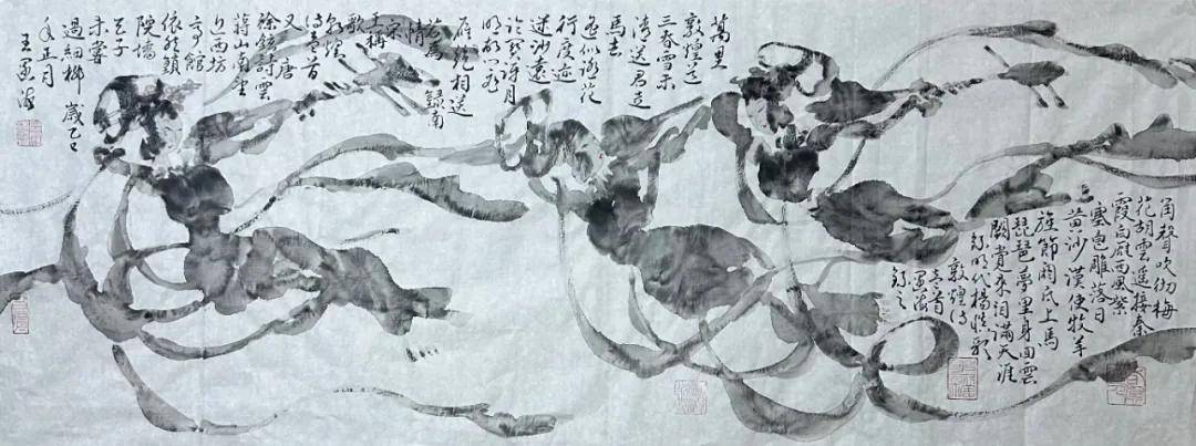 单一题材难以支撑品牌的长久生命力,王阔海先生在坚守新汉画核心风格的同时,构建了多元的题材生态,既巩固了其艺术品牌的辨识度,又拓展了受众边界。其创作大致可分为三大板块:以汉画元素为核心的历史与现实题材、以十二生肖为代表的动物画系列、以及融入汉画意趣的山水花鸟作品。