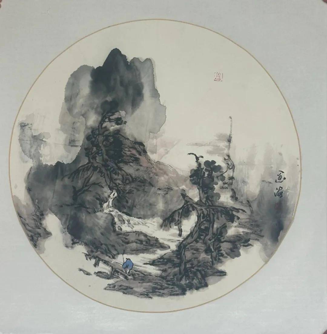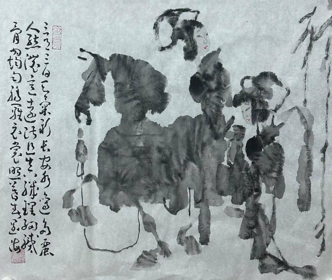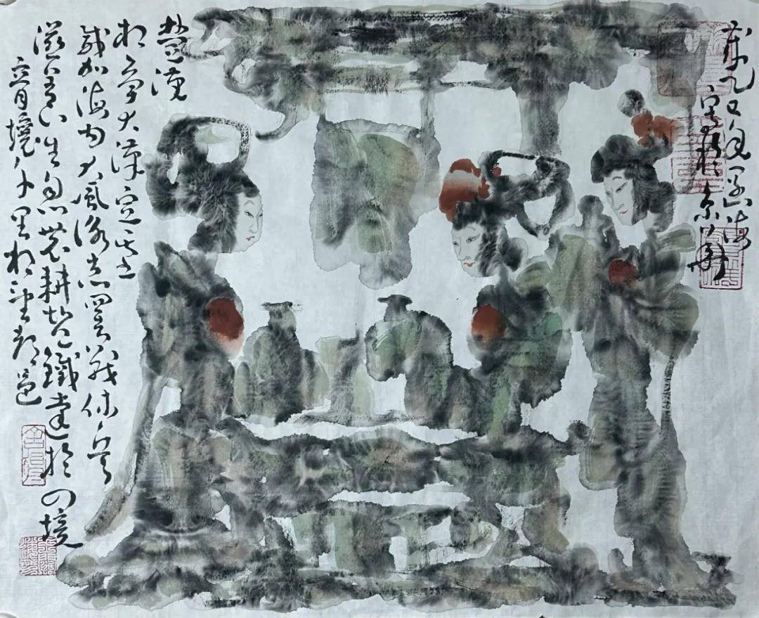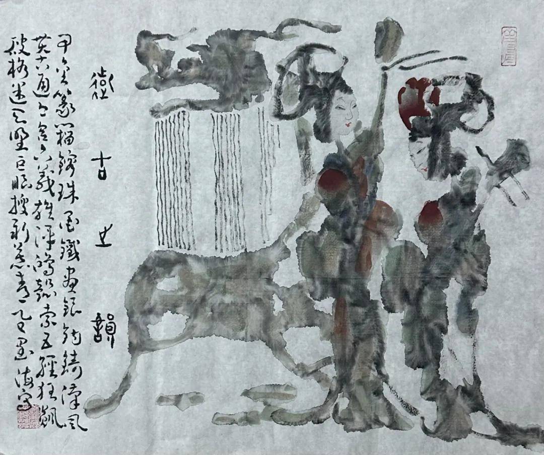 他创造性地融合了汉砖、汉瓦、金石的斑驳肌理与没骨画法的氤氲意境,在冲墨冲色间营造出“似有若无、玄之又玄”的视觉效果。这种技法并非简单的形式嫁接,而是对传统资源的深度萃取:从汉画像石中提炼构图的张力,从唐三彩中汲取色彩的厚重,从剪纸皮影中借鉴造型的概括,最终通过水墨的晕染实现有机融合。如《古汉画印象》中,车马出行的雄强姿态保留了汉画的刚健,而水墨的朦胧感又赋予作品当代审美意趣,这种“古意新境”的视觉效果,成为新汉画品牌最鲜明的技术标签。