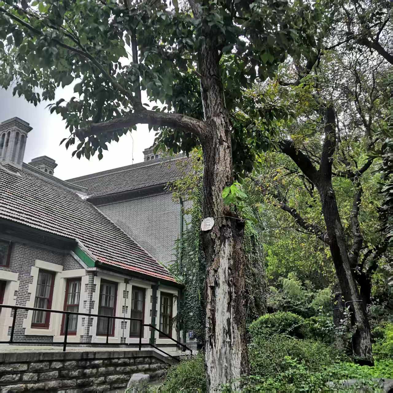 2005年10月17日,雨,余步行至齐鲁医院古建筑群,欣赏一下这些斑斑驳驳的信息。忽然发现有一颗菩提树,在雨中……