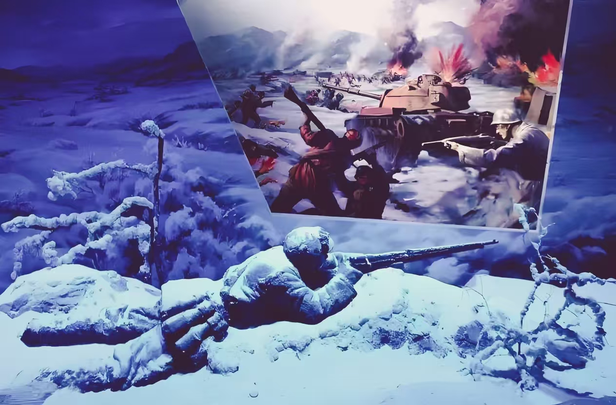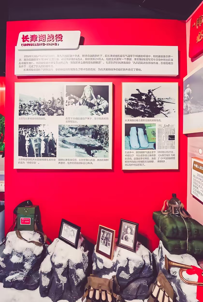 但此行最让我牵挂的,还是“长津湖战役”展区。转过一个拐角,一股寒意仿佛扑面而来——展区特意调低了温度,墙上的温度计显示着“-30℃”,玻璃展柜里陈列着志愿军战士的棉衣,单薄的布料上还沾着冰雪,鞋底早已磨穿,露出里面的草屑。“1950年11月,志愿军第九兵团奉命入朝,参加长津湖战役。当时第九兵团刚从东南沿海调来,因入朝紧急,很多战士还穿着单衣,就奔赴了零下三四十度的战场。”讲解员的声音低沉下来,“他们昼伏夜行,在崇山峻岭中隐蔽行军,饿了就啃冻硬的土豆,渴了就抓一把雪,很多战士的脚、耳朵都冻成了紫色,却没人叫苦。”