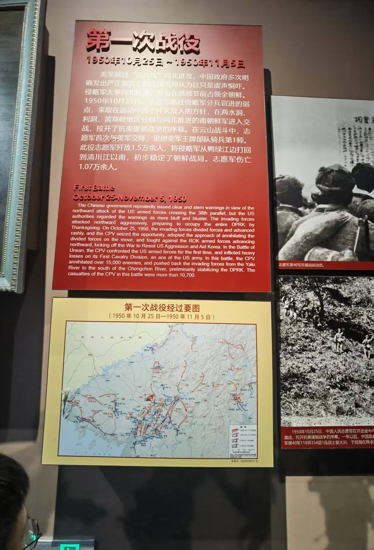 展柜里陈列着当年的电报手稿,字迹工整却带着急促,那是中央军委下达的一道道命令;墙上的照片里,志愿军战士们背着行囊、扛着步枪,趁着夜色跨过鸭绿江,江面的冰层还未封实,他们的裤腿沾满泥水,却没人回头——身后是祖国的灯火,身前是未知的战场,可他们的眼神里只有坚定。讲解员说:志愿军入朝后,先后发动了五次战役,从第一次战役的“遭遇战”打破美军“圣诞节前结束战争”的妄想,到第二次战役的“迂回包围”扭转战局,再到第五次战役的“粉碎美军登陆计划”,一步步将战线稳定在三八线附近,为战争的胜利奠定了基础。
