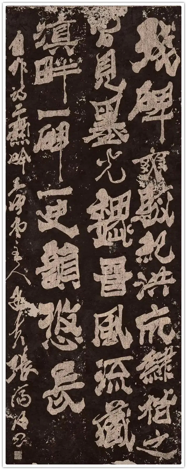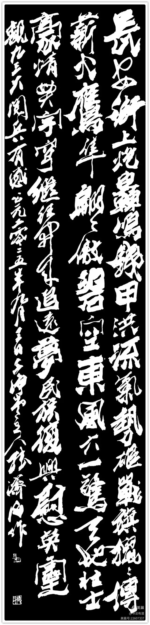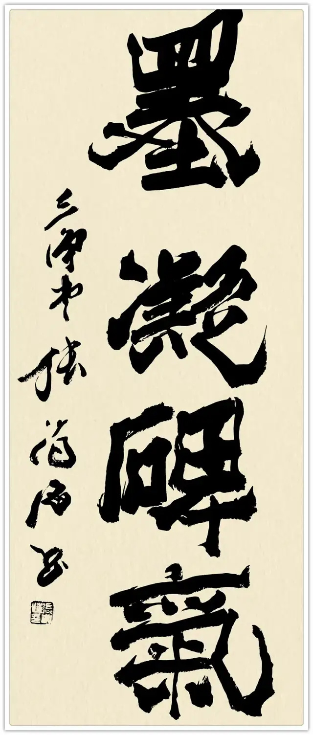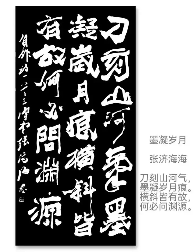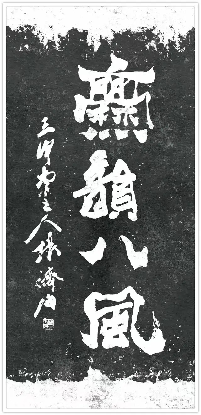 爨八体的“重构”,绝非简单的“碑体复刻”。他将篆书的圆融裹入爨体的方折,把隶书的波磔藏进笔画的顿挫,让每一个字既有“石痕”的古拙,又有“墨魂”的灵动:写“石”字如凿碑,起笔的方硬带着魏晋的风骨;作“魂”字似揉面,收笔的圆转漾着当代的温度。这种“方中藏圆、古里透今”的笔法,让爨体从博物馆的拓片里走出,成了“瞅着舒坦”的生活美学——正如他的《石痕墨魂》,黑底白字的斑驳如碑,笔锋的舒展却如墨韵流转,是“古意”与“今心”的共生。