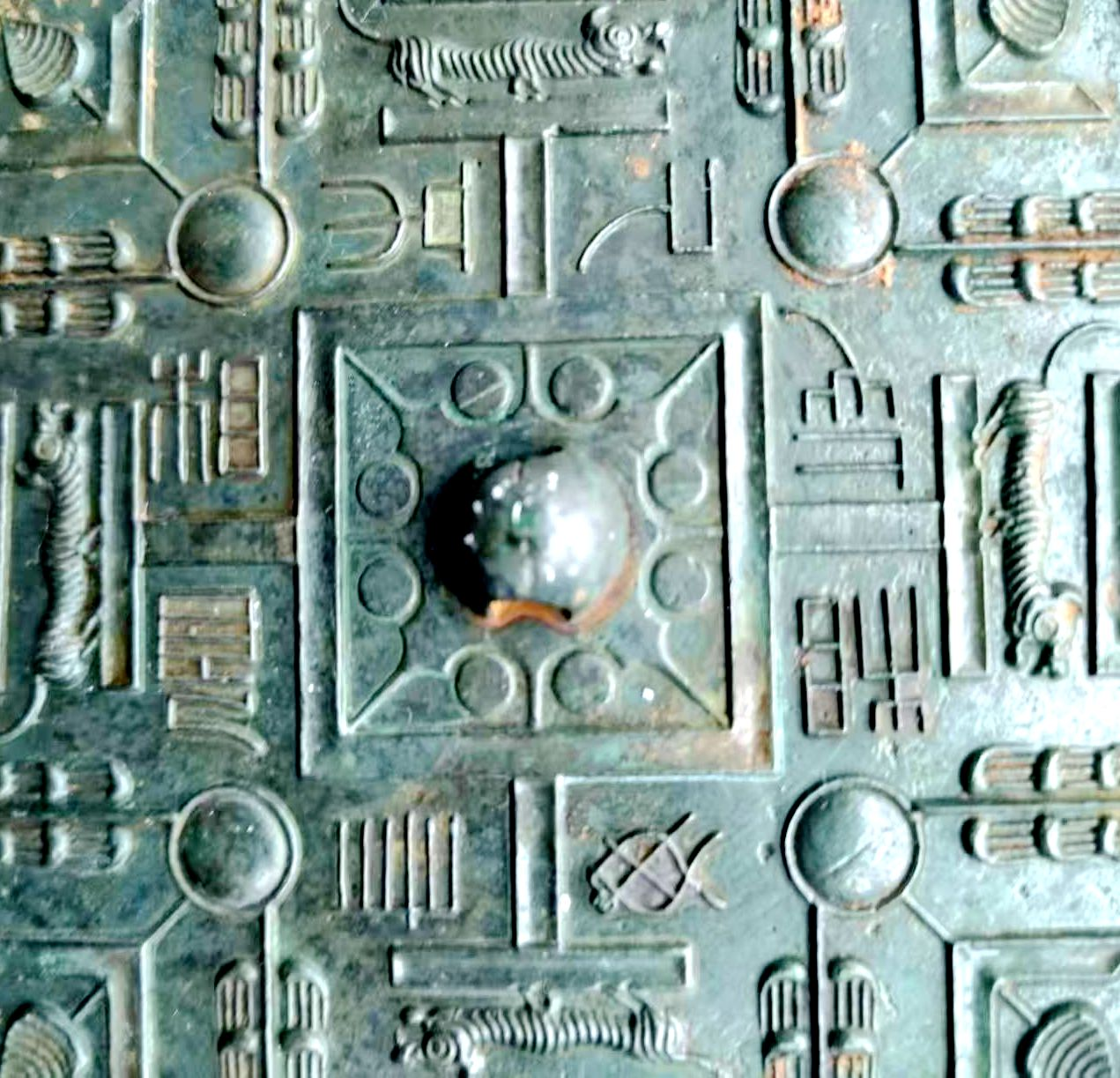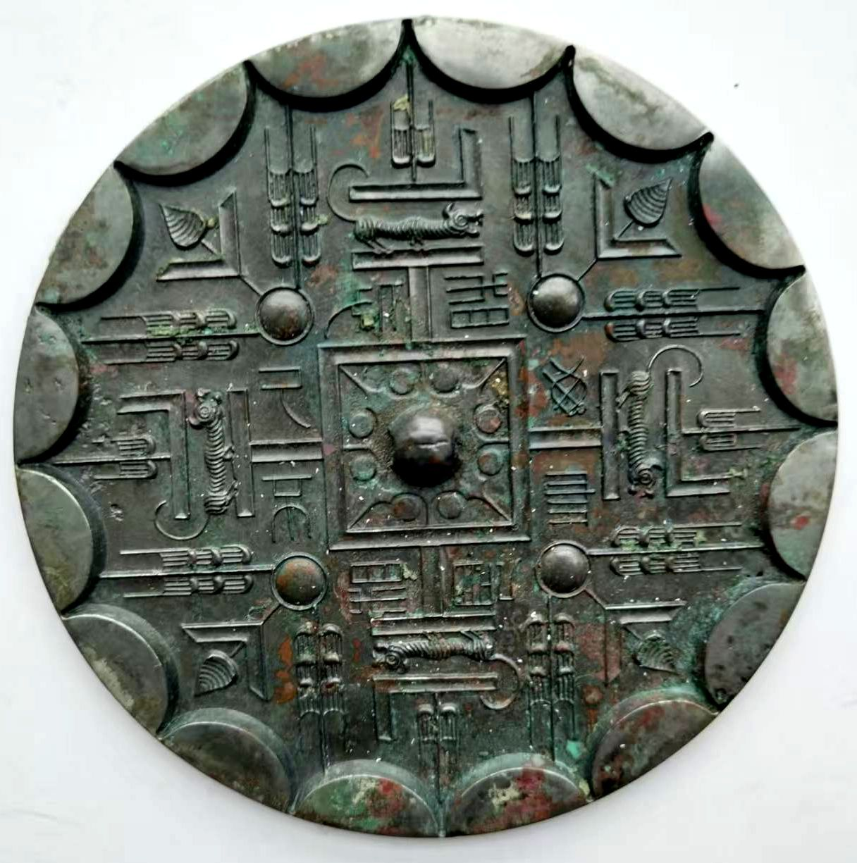 四只老虎环绕镜背四面,彼此呼应,既填充了纹饰空间,又与规矩纹形成刚柔并济的视觉平衡,让整体构图既庄重又不失生机。