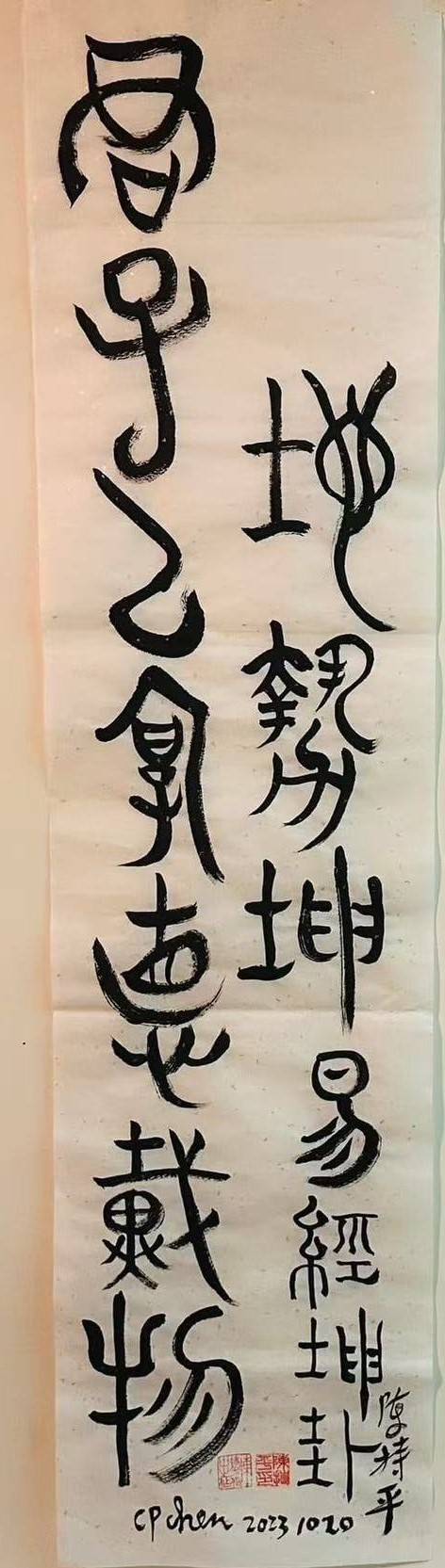 “天行健,君子以自强不息;地势坤,君子以厚德载物”—— 这两句出自《易经》的箴言,在陈持平的笔下演绎出别样的生命力。