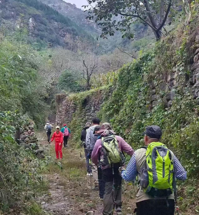 驴道虽然痕迹尚在,但被雨水冲得都难以辨认了。我甚至怀疑我们走得不对,但方向没有问题,也只能跟着感觉走了。直到见了石头铺设的沧桑古道,进入了两侧石壁夹道的“石门”,我忽然记起来了,便对众众驴友说,咱们走得对,但都别在这一段磨叽,得赶紧通过,以防石壁上落石。
