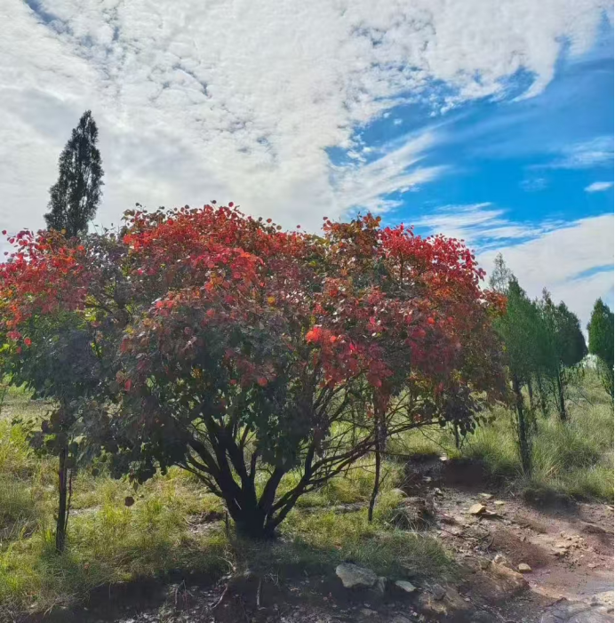 山坡顶是一大片黄草地,有棵黄栌已经红了一大半,远看就像一团火似的。这是我们今天见到的唯一一棵几乎全红的黄栌,她预示着澷山红遍的深秋即将到来了。
