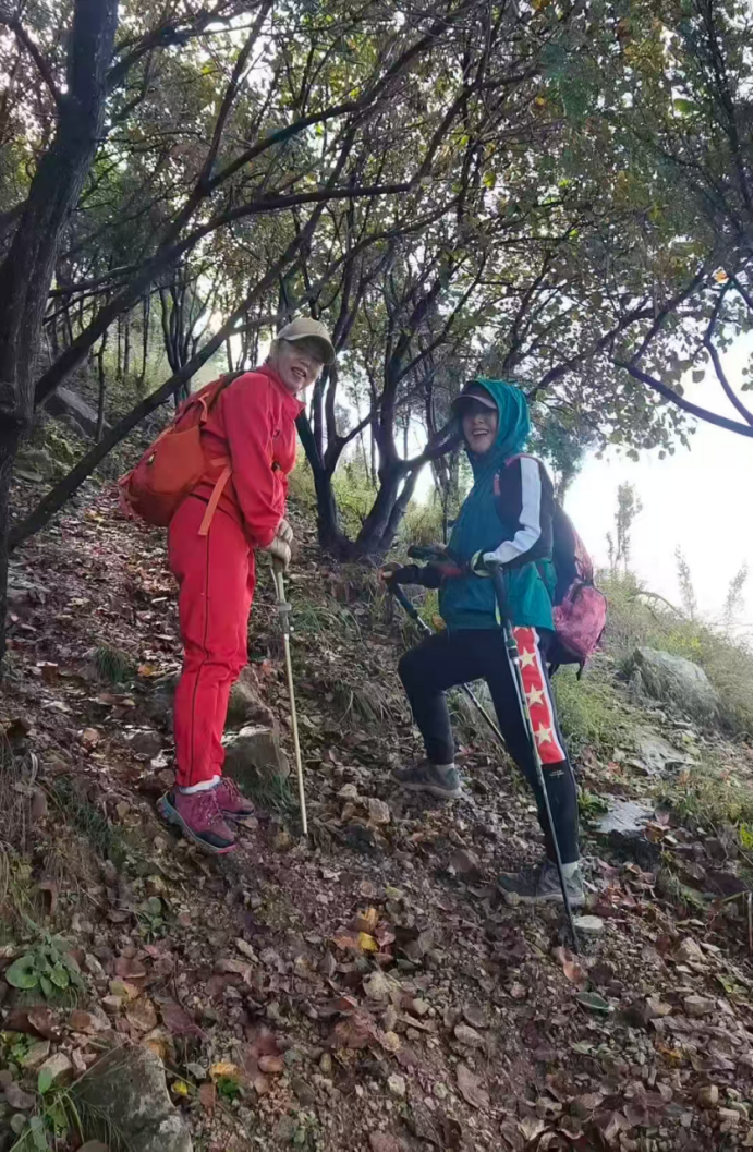 山坡甚为陡峭,加上雨后地面湿滑,攀登起来更加艰难。好在山坡上有许多的黄栌和松树可以借力,大家陆续地登上峰顶。