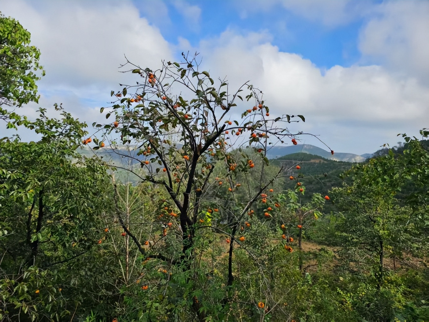 众驴友走出“石门”一段,眼前豁然开朗,一条古老的山路沿着山崖蜿蜒而上,只是很久少人走,显得有点荒凉罢了。路边又出现了几棵柿子树,树上挂满了金黄色的小灯笼,煞是好看。俟几日绿叶落尽就更美了。忽然想起古人造的“金秋”一词之妙了。