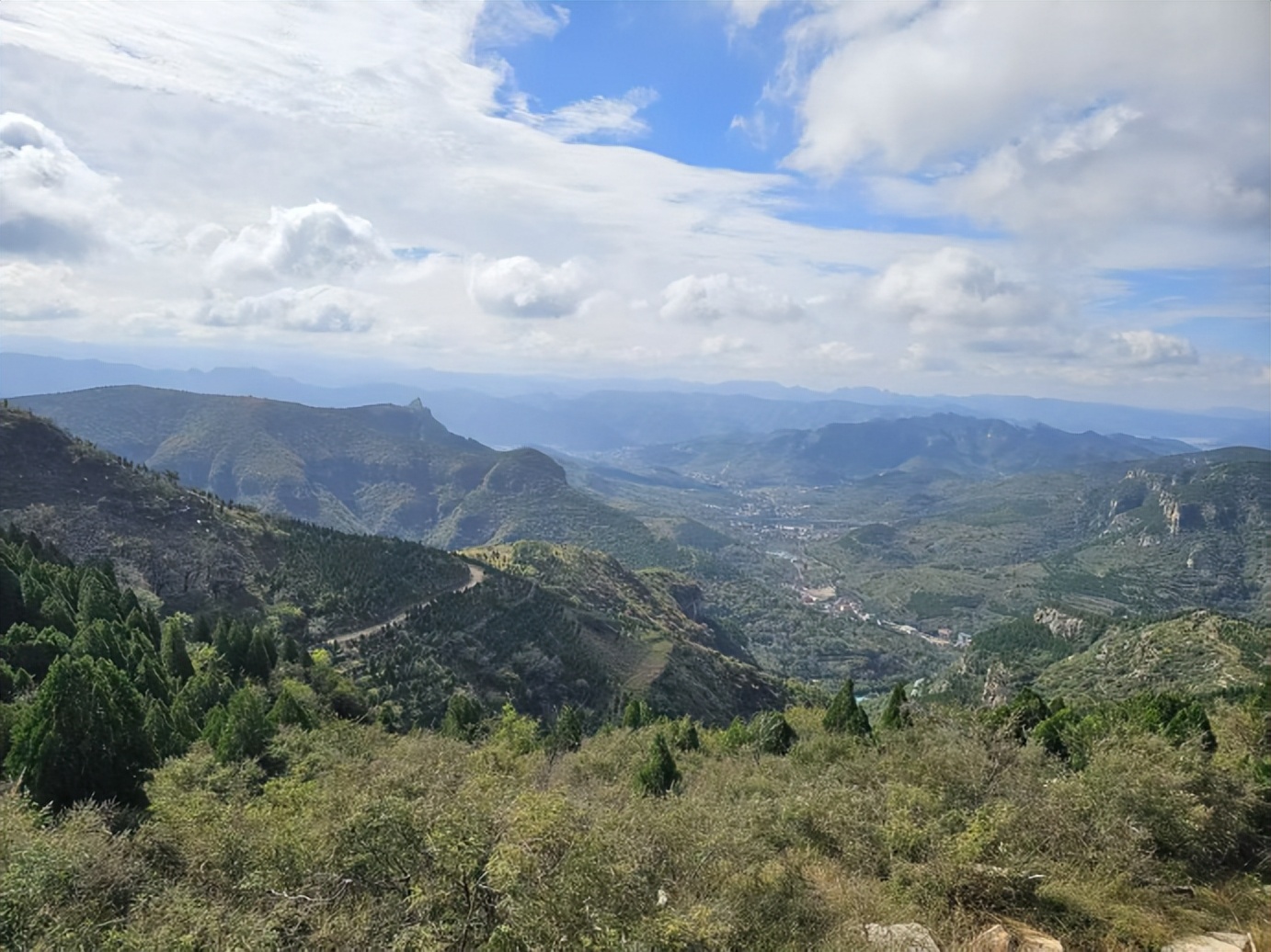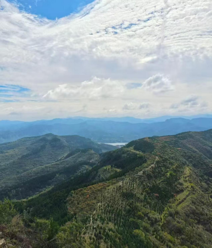 站在峰顶,俯瞰山下,大佛村以及小佛村还有远处的刘家等村庄均历历在目,我们早上就是沿着这条线路来到青铜山下的。现在居高临下,看群山起伏,赏万壑淡烟,心情之美是没得说了。尤其是能够看到10公里之外的卧虎山水库的那一角蓝色的碧光,更是令人欣慰。可惜看万山红遍,层林尽染还不到时候,这算是此次登高的美中之不足吧。