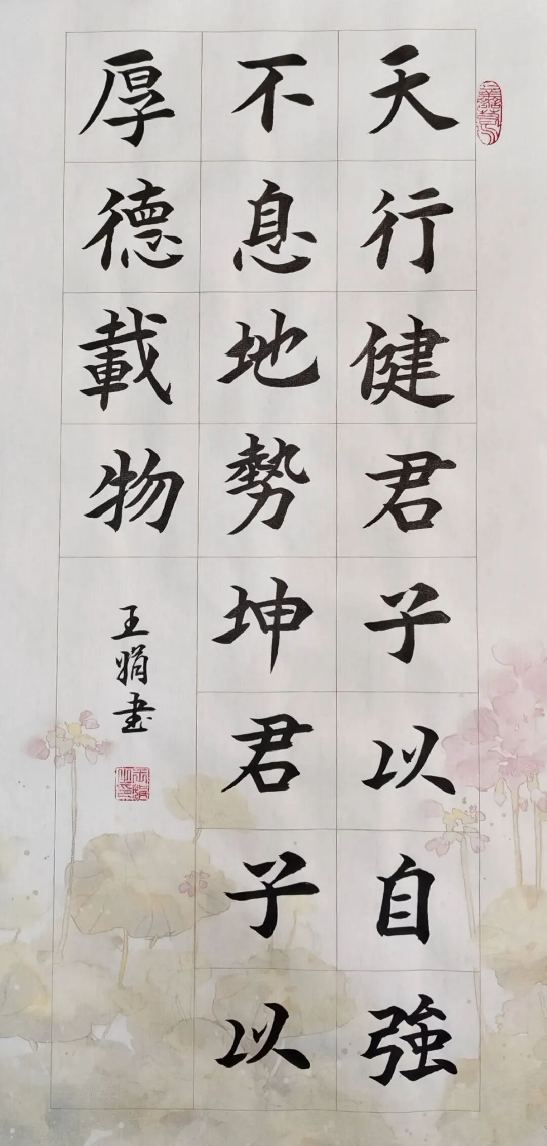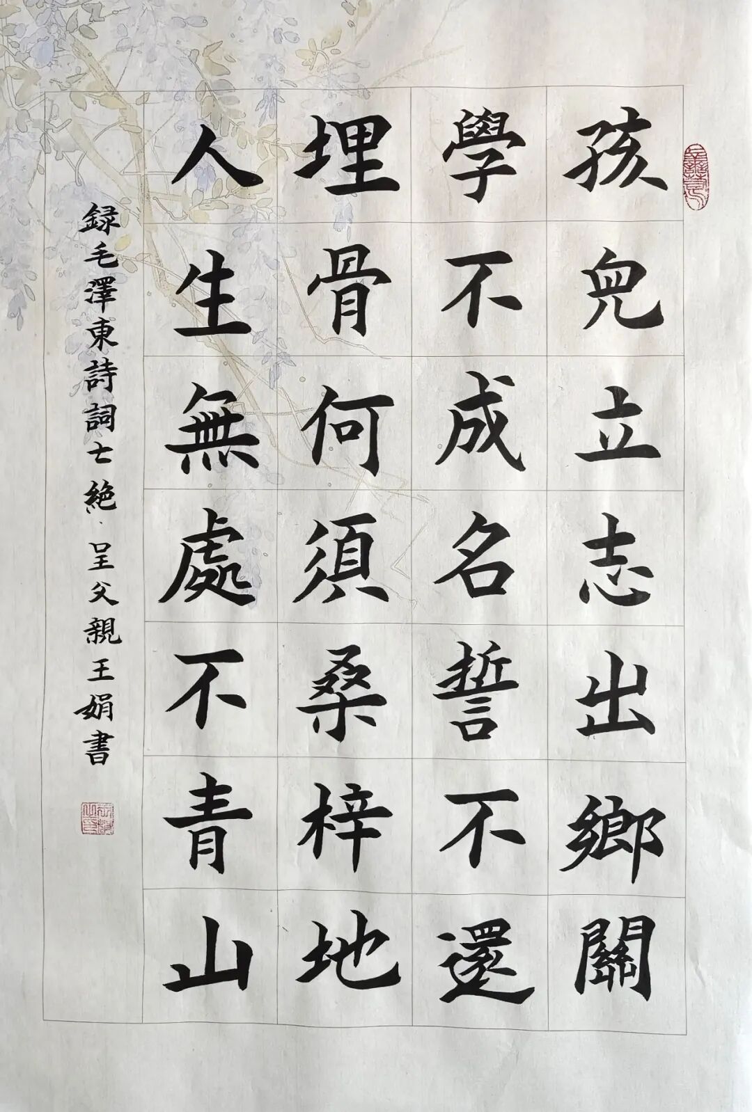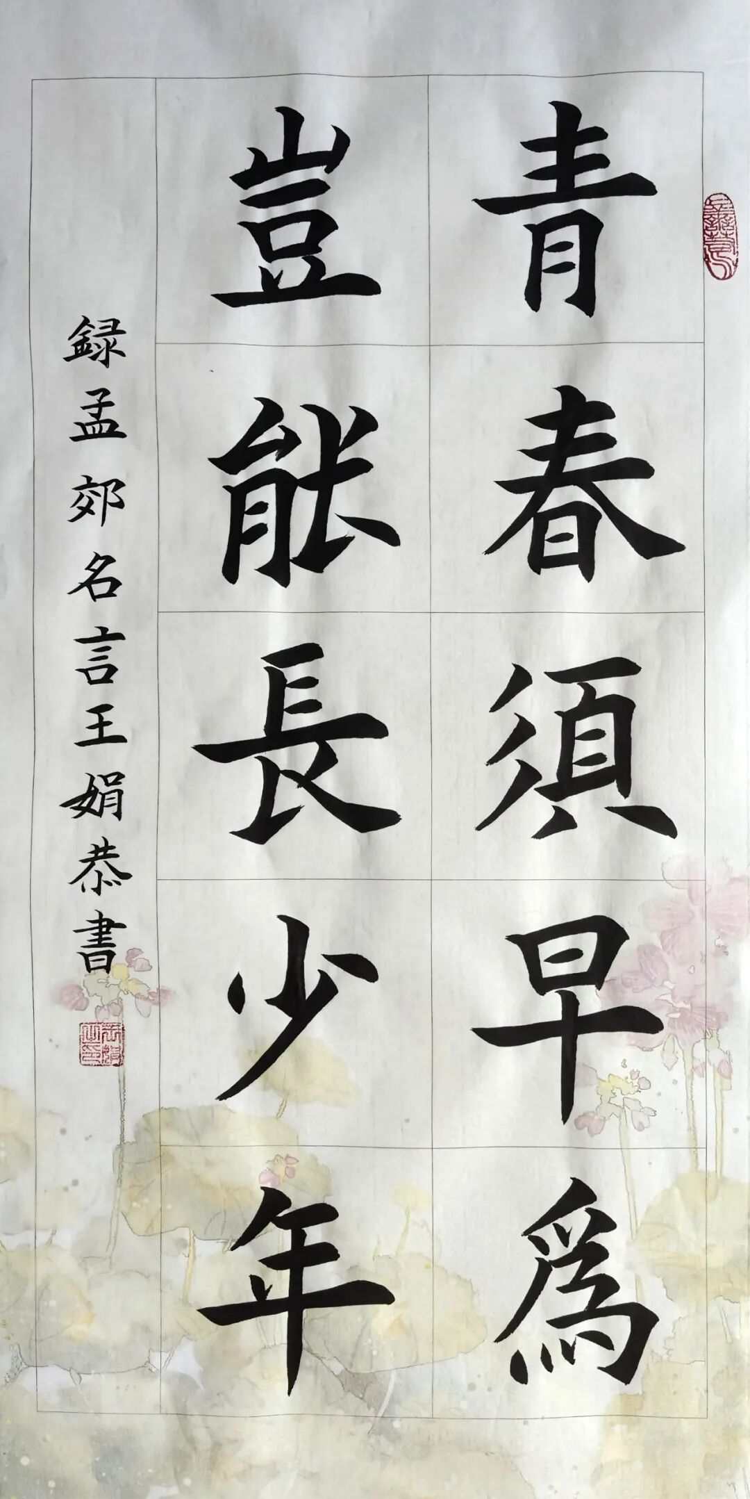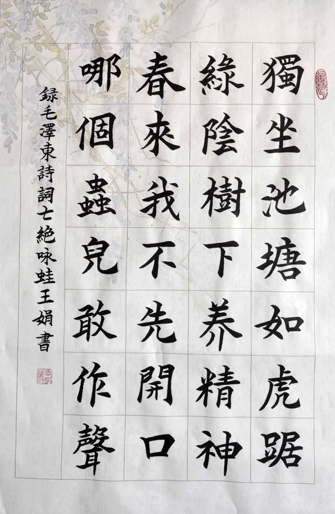 王娟,擅长楷书,学习欧阳询、颜真卿、黄自元、田英章等大家之书法,经过多年的艰苦磨炼,汲取圣贤名师之精髓,大胆创新,努力形成自己的风格。