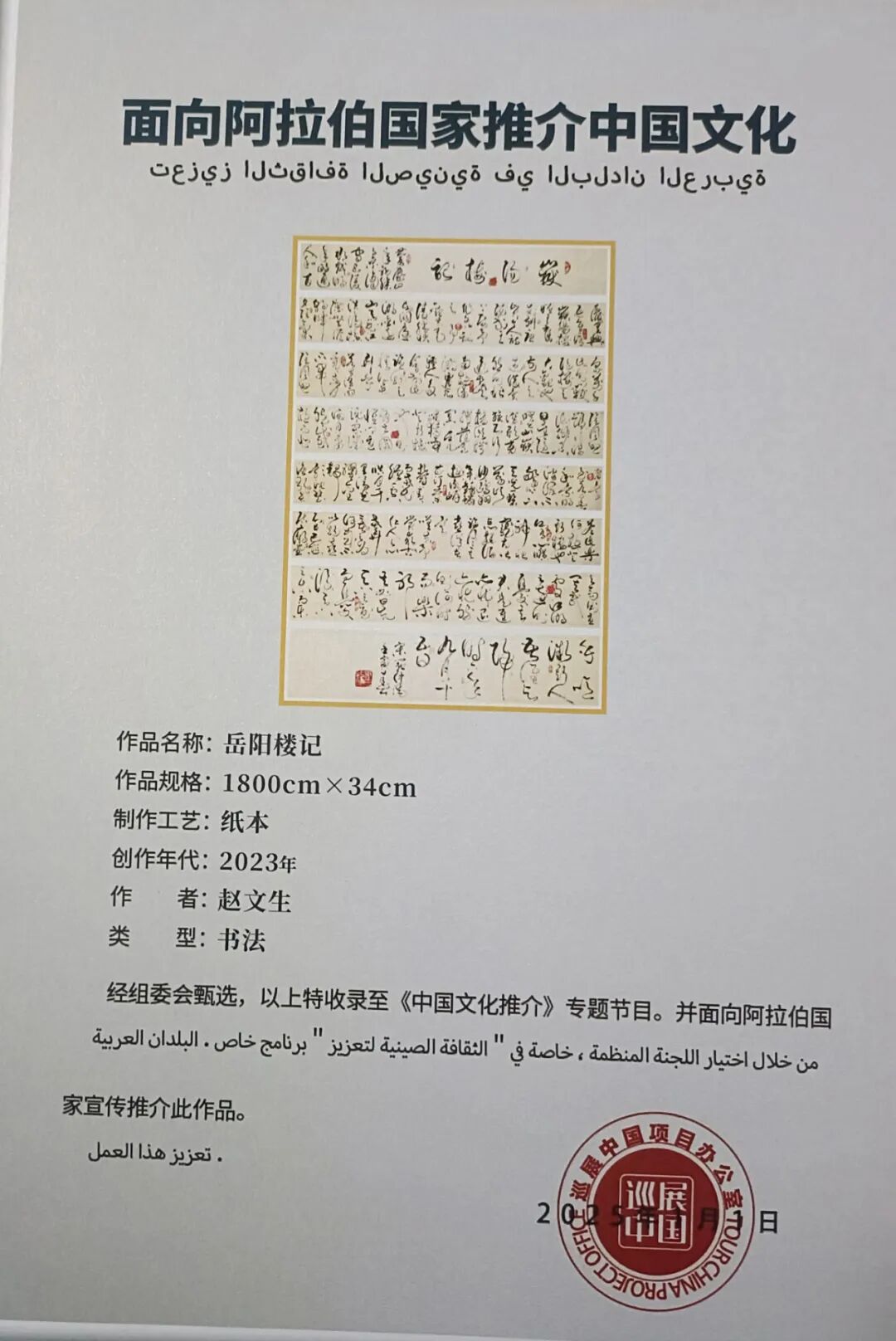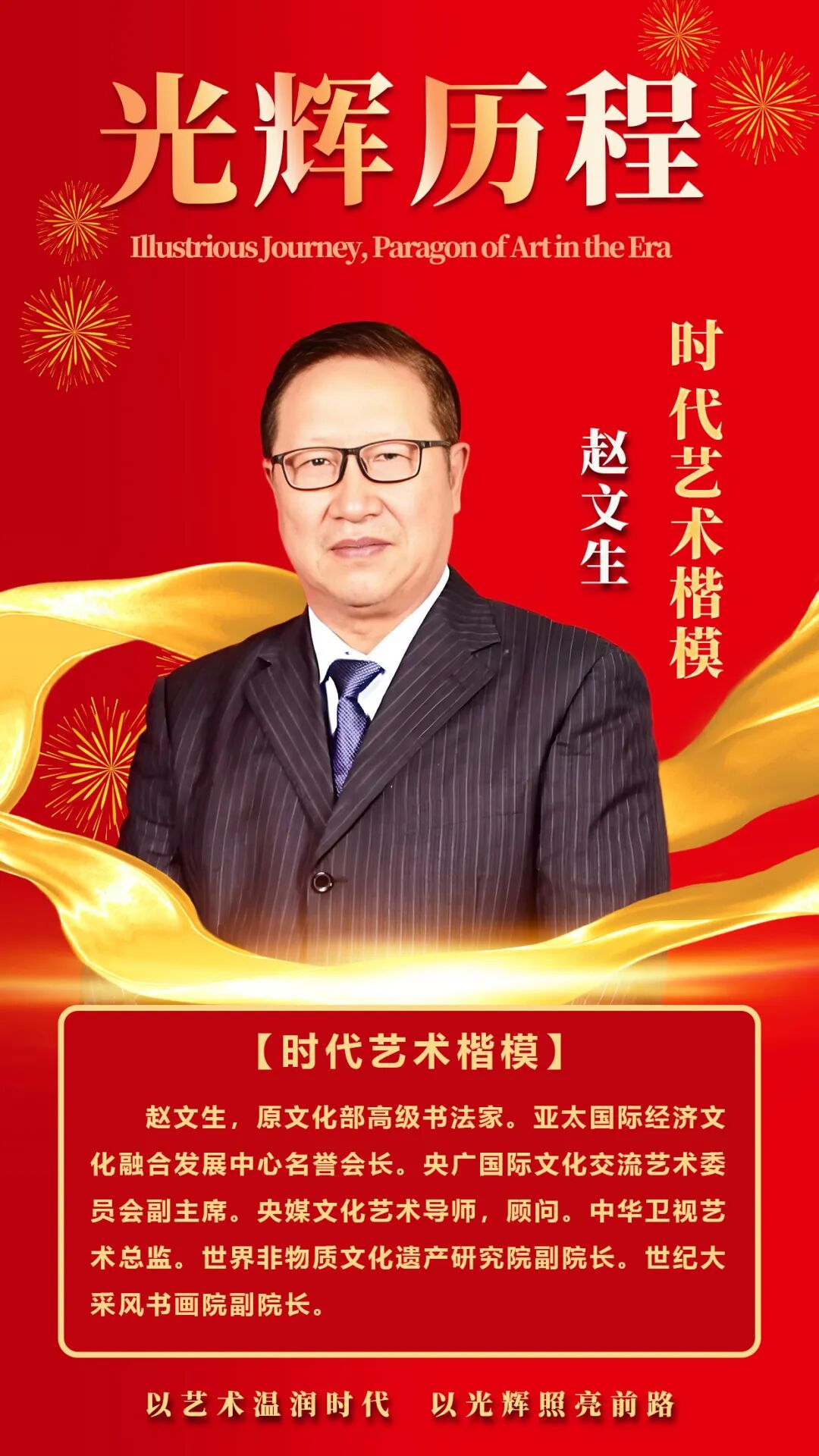 先后获得“世界和平艺术贡献者”奖。获西班牙皇家艺术协会、毕加索故宫博物院、巴塞罗那艺术学院联合颁发的“优秀导师”奖。获国际金牌艺术家及中国艺术首届金马奖。2025达芬奇国际艺术奖金奖。艺术中的诺贝尔奖获得者。“金砖艺术家”。胡润全球艺术金笔奖。全国“五个一工程奖”。“孔子奖章艺术顾问”。被人民日报授予“新时代书画艺术先锋人物”。草书得到范曾、薛永年教授极高的评价。先后有多本教材、专集,合集在全国发行。多次走进央视并登上笔尖下的中国栏目。作品分别在北京机场候机厅,高铁站,首都地铁展播,影响国内外。被授予当代最具收藏和艺术价值的书画家。先后被中宣部授予“时代楷模——笔尖下的中国赵文生”;被文联授予“全国艺术劳动模范”称号。被文旅部授予“共和国艺术楷模”荣誉。被中书协,中美协等授予“人民书画家”称号。同年被央广国际文化交流艺委会授予“中华文化品牌′人物”。2023年”文化中国传播大使”特别授予<意草书法创始人>。长卷《岳阳楼记》被专家评审团授予国宝并被国宝档案存档。2024年受邀中国教育电视台录制“欢乐中国年”节目。2025年国宝长卷<岳阳楼记>等二幅作品被推介到阿拉伯国家。被中视文化产业聘为“书法评论家”。