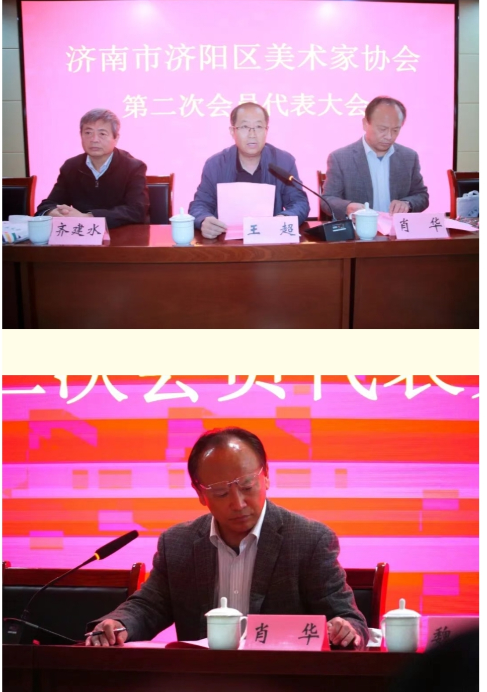 济阳区文联主席党组书记、换届选举领导小组组长王超出席会议并讲话。区文联副主席党组成员、换届领导小组副组长肖华主持会议。第一届美协主席张华之、美协换届选举委员会主任菅庆英及民政局社会组织科有关领导参加了会议。山东艺术设计职业学院党委委员副校长魏广、济阳区作家协会主席齐建水受邀在主席台就坐参加会议。