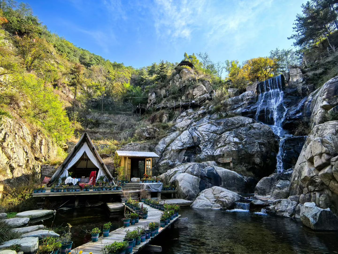 九如山的匠心,藏在每一处细微里。那些依山而筑的木屋,窗含远岫,门对清流,教人顿生归隐之思;沿途新植的翠竹,在萧瑟秋风中犹自亭亭,为山色添了几分文人风骨;更有二十四泉暗涌,如大地脉动,与游人的心跳共鸣。山民说,这些年封山育林,方得此间葳蕤——原来最美的风景,需要最耐心的守候。