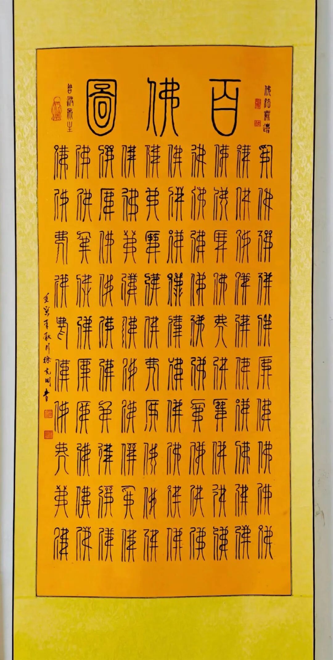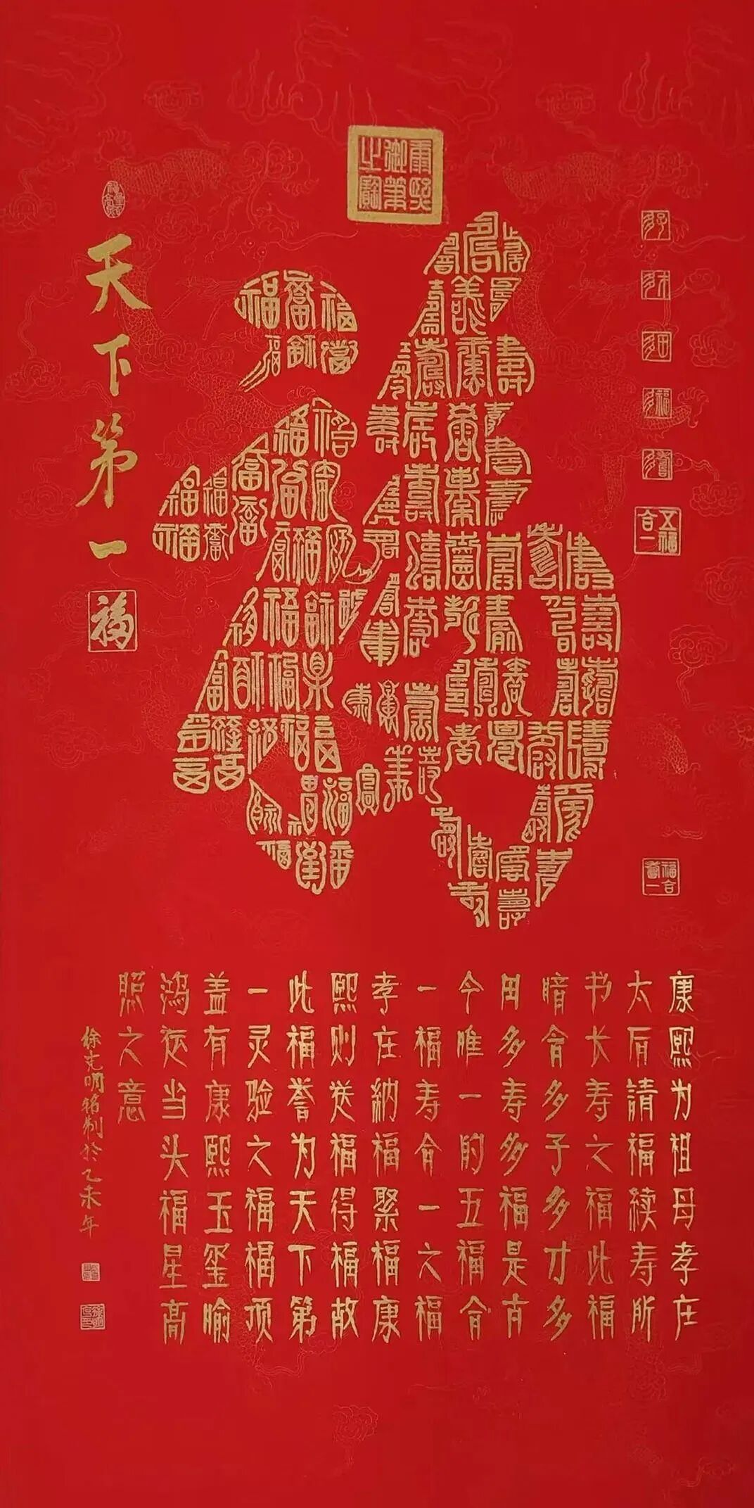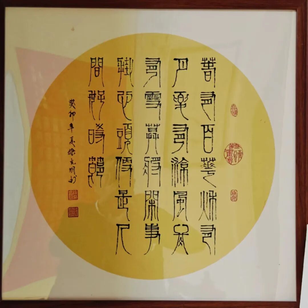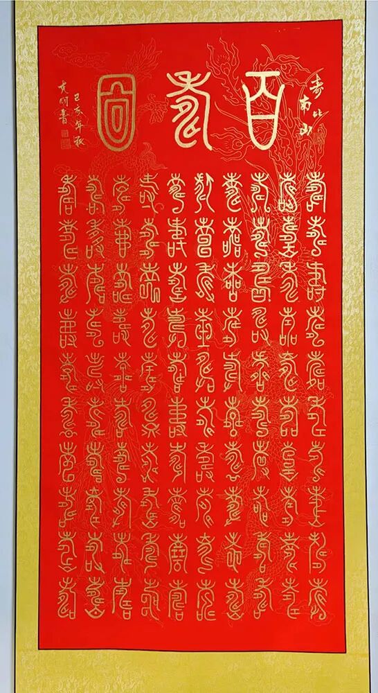 柏油画的艺术魅力源于其多重创新特质。在材质层面,经过特殊处理的柏油既保持了墨色的沉稳厚重,又创造出层次丰富的肌理变化;在技法层面,徐克明先生将传统笔墨的写意精神与材料的自然特性完美融合,形成了一套独特的创作体系;在审美层面,作品既延续了中国画的意境追求,又展现出强烈的现代艺术表现力。观其柏油画作,或如泼墨般酣畅淋漓,或如工笔般细致入微,或如篆刻般古朴凝重,在虚实相生间构建出一个充满哲学思辨的艺术世界。这项获得国家发明专利的艺术创新,正是对其独特艺术价值的最佳印证。 除了在绘画领域的创新突破,徐克明先生在书法篆刻方面同样成就斐然。其篆书作品《天下第一福》以古朴浑厚的笔法,展现出深厚的传统功力,同时在结体布局上融入现代审美意识,使作品既具古韵又不失时代气息。与之相映成趣的《百佛图》以篆书为体,通过百种不同的体势变化,将"佛"字演绎出万千气象。每个字都仿佛被注入了独特的生命律动——或取法金文之苍劲,或得韵秦篆之端庄,或参酌汉篆之浑朴,在统一中见变化,在规整中显灵动。这种"百相归宗"的艺术构思,既体现了对篆书传统的深刻领悟,又展现出非凡的艺术创造力。徐克明先生的艺术成就,不仅体现在其开创性的艺术探索上,更彰显于其高尚的艺术品格之中。四十余年如一日对柏油画的潜心钻研,见证了他对艺术理想的执着坚守;从不受市场潮流左右,始终保持独立的艺术追求,展现了他"淡泊明志"的精神境界。在艺术创作中,他秉持"艺品即人品"的信念,将内心的宁静淡泊融入笔端,使作品既具创新锐气,又不失传统文人的风骨。这种将艺术创新与人格修养完美融合的境界,正是其作品能够超越技法层面,达到更高艺术维度的根本所在。