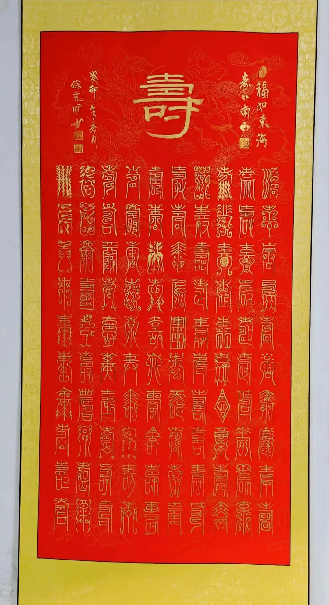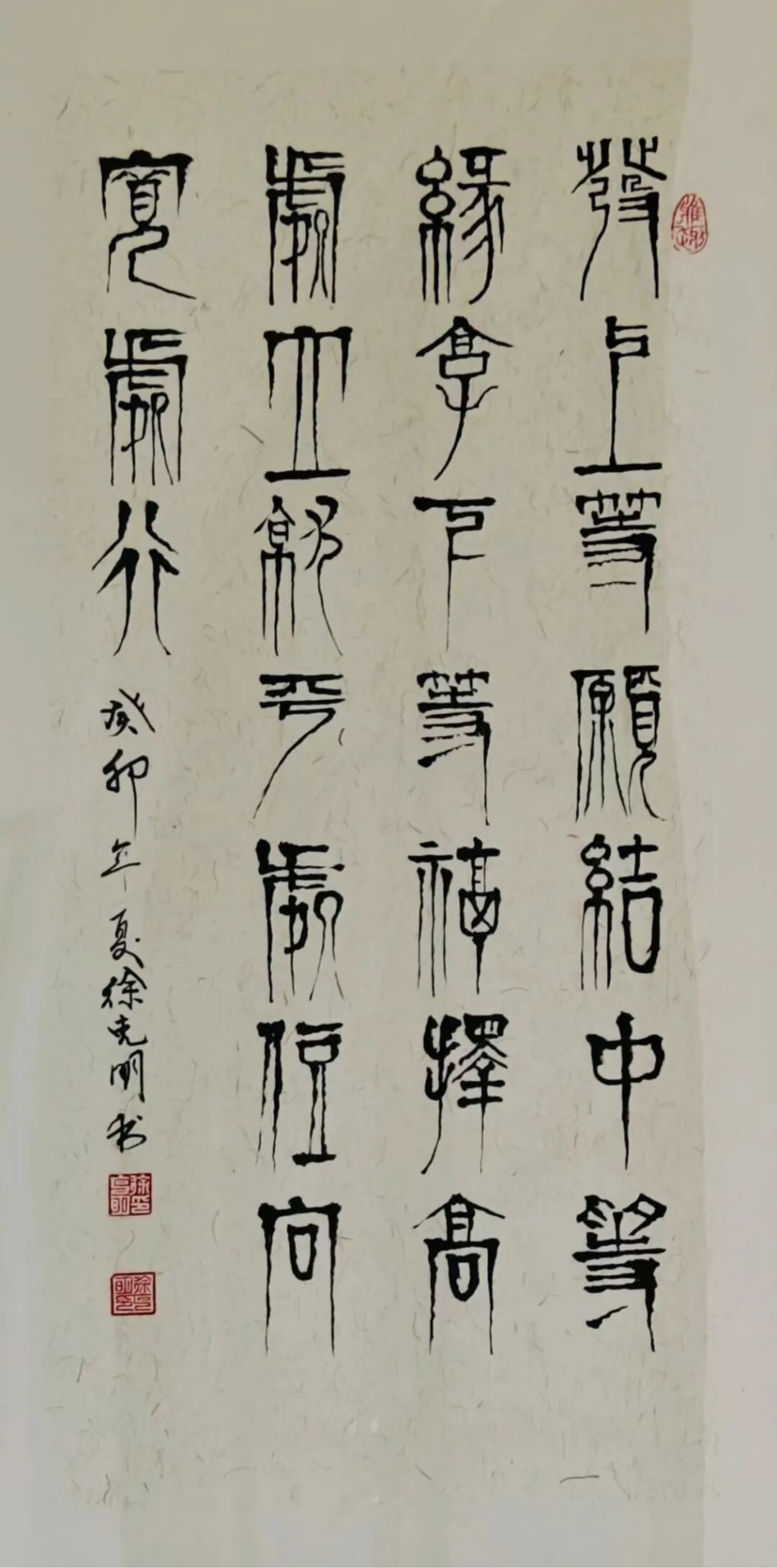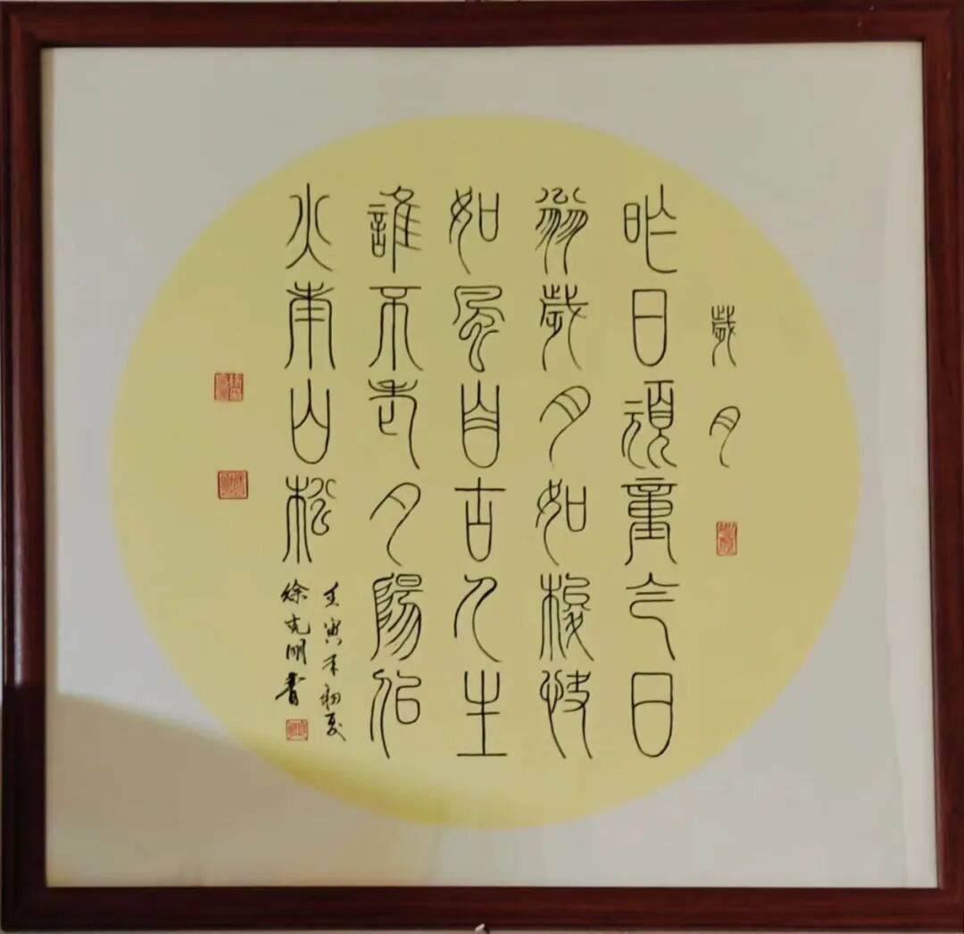 柏油画的艺术魅力源于其多重创新特质。在材质层面,经过特殊处理的柏油既保持了墨色的沉稳厚重,又创造出层次丰富的肌理变化;在技法层面,徐克明先生将传统笔墨的写意精神与材料的自然特性完美融合,形成了一套独特的创作体系;在审美层面,作品既延续了中国画的意境追求,又展现出强烈的现代艺术表现力。观其柏油画作,或如泼墨般酣畅淋漓,或如工笔般细致入微,或如篆刻般古朴凝重,在虚实相生间构建出一个充满哲学思辨的艺术世界。这项获得国家发明专利的艺术创新,正是对其独特艺术价值的最佳印证。 除了在绘画领域的创新突破,徐克明先生在书法篆刻方面同样成就斐然。其篆书作品《天下第一福》以古朴浑厚的笔法,展现出深厚的传统功力,同时在结体布局上融入现代审美意识,使作品既具古韵又不失时代气息。与之相映成趣的《百佛图》以篆书为体,通过百种不同的体势变化,将"佛"字演绎出万千气象。每个字都仿佛被注入了独特的生命律动——或取法金文之苍劲,或得韵秦篆之端庄,或参酌汉篆之浑朴,在统一中见变化,在规整中显灵动。这种"百相归宗"的艺术构思,既体现了对篆书传统的深刻领悟,又展现出非凡的艺术创造力。徐克明先生的艺术成就,不仅体现在其开创性的艺术探索上,更彰显于其高尚的艺术品格之中。四十余年如一日对柏油画的潜心钻研,见证了他对艺术理想的执着坚守;从不受市场潮流左右,始终保持独立的艺术追求,展现了他"淡泊明志"的精神境界。在艺术创作中,他秉持"艺品即人品"的信念,将内心的宁静淡泊融入笔端,使作品既具创新锐气,又不失传统文人的风骨。这种将艺术创新与人格修养完美融合的境界,正是其作品能够超越技法层面,达到更高艺术维度的根本所在。