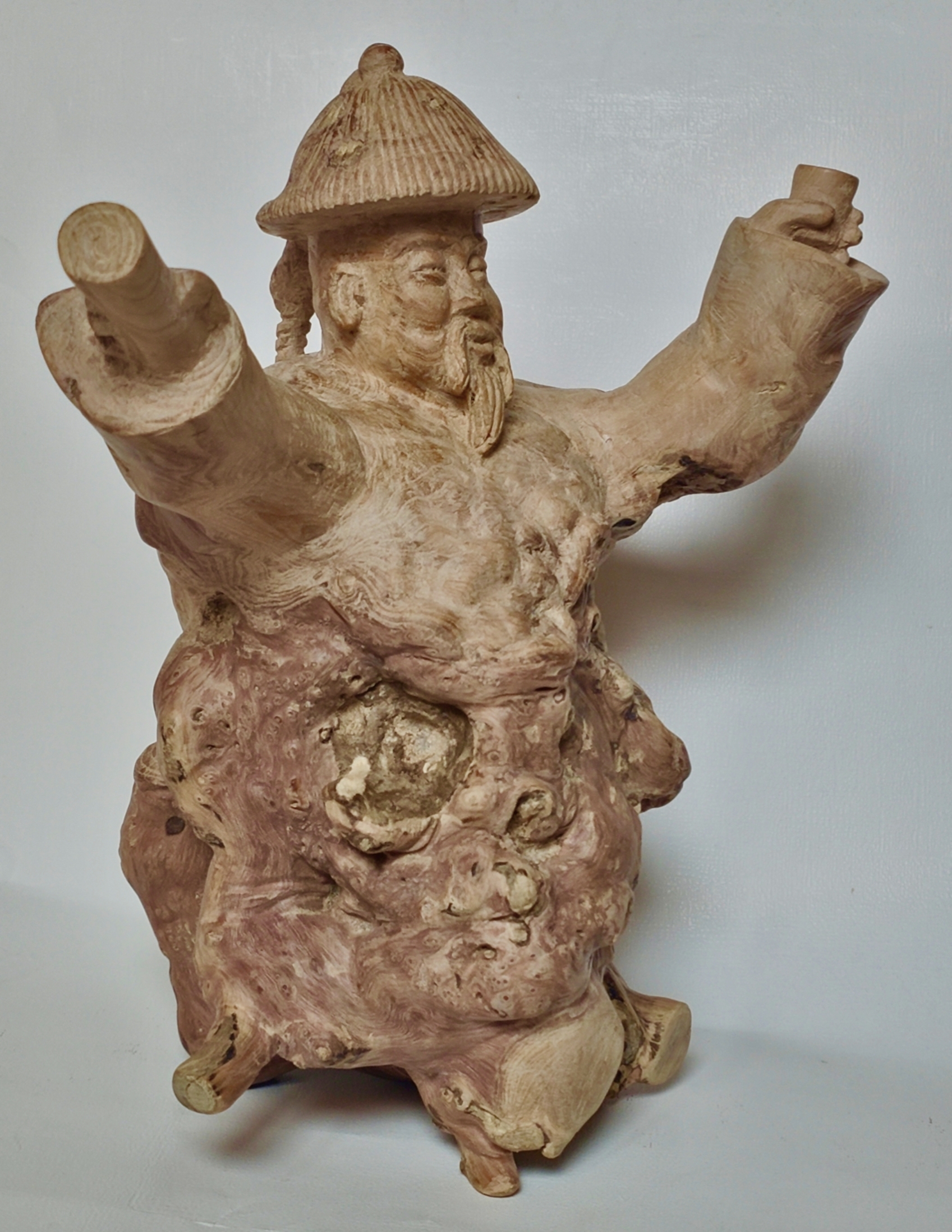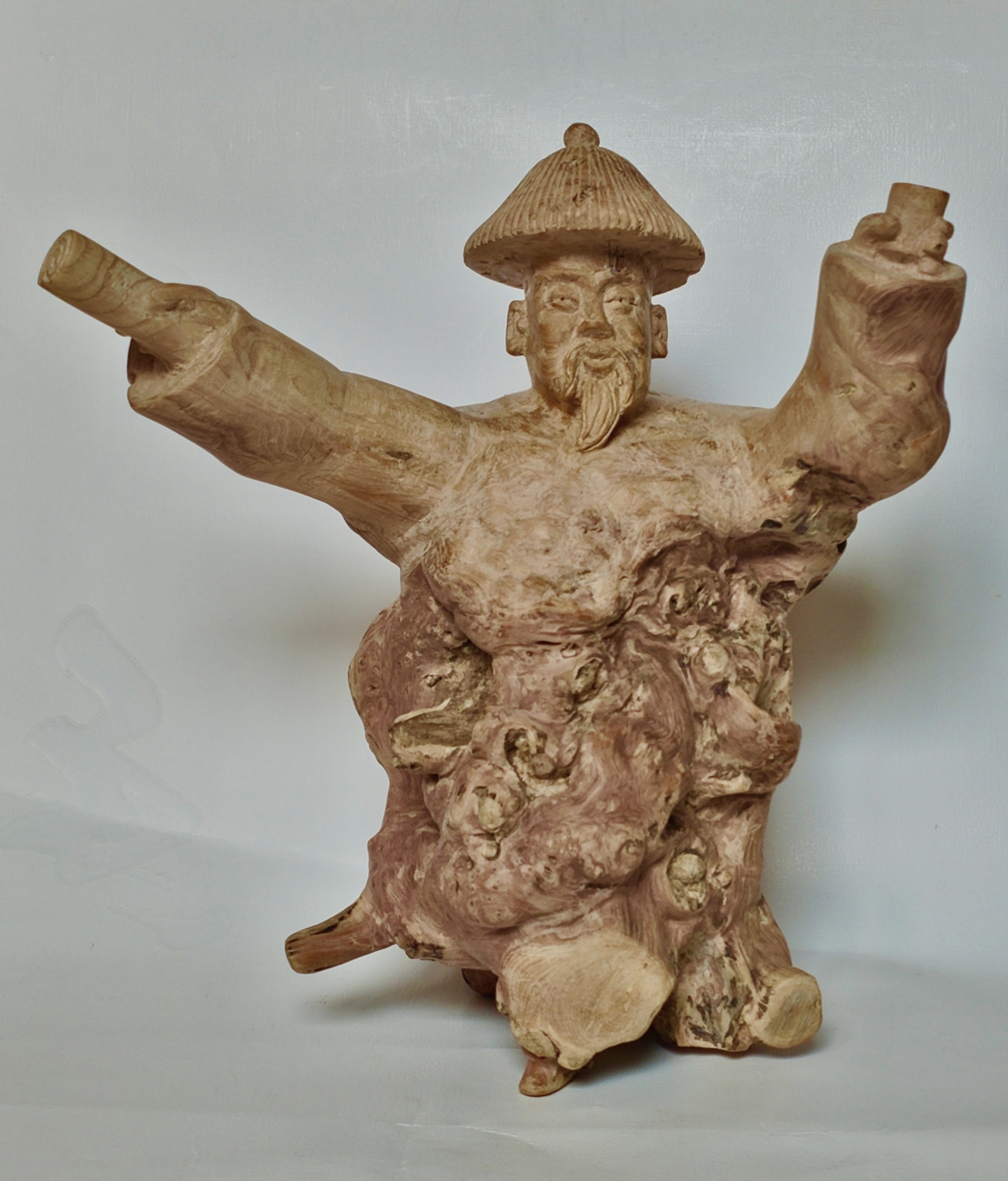 荆棵根雕《田雯》,利用荆棵根的自然形状,雕刻岀田雯头戴官帽,一手举诗稿,一手举酒杯,以体现田雯为官为学的一生,以及爱诗好酒的″诗酒风流”韵事。