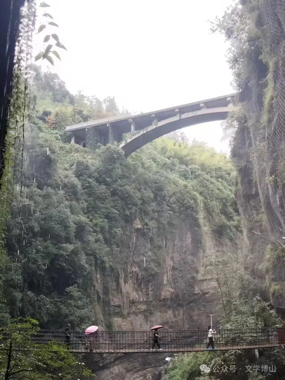 我们沿着水帘洞式栈道,耳闻雨声和潺潺流水声,不一会儿就来到右手边的第二叠瀑布。我扬起右手臂,以前面上下天桥为背景,拍照留念。之后,又继续前行,来到下层天桥旁,从左山壁慢慢走到右山壁。当我小心翼翼走过天桥后,看到山洞门上赫然镌刻着“峡谷胜景”四个大字,可谓恰如其分,名副其实!