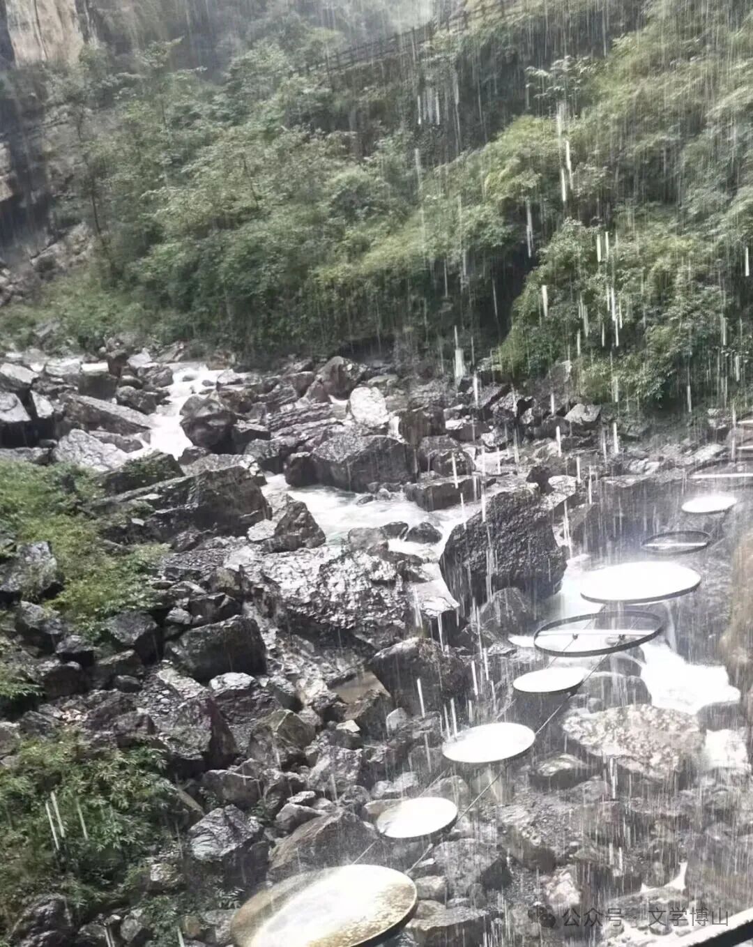 听说通往云龙地缝的路崎岖难行,上下台阶无数,我和旅友特意买了3元一根的木拐杖,以助己一臂之力。一点四十分,我们“康寿文旅 长江三峡9日游”一行二十人在李总和张导的带领下,撑着雨伞,便进了云龙地缝旅游景区。经过一番崎岖的下坡路后,我们先是听到了瀑布声响,接着一条白练直冲而下,呈现在眼前!此处是第一处瀑布。这从天而降的瀑布,携带着雪白的浪花加上哗哗的雨声的伴奏,雪沫纷纷直冲而下,激起浪花飞作潭间雪,美得煞是迷人眼。我迫不及待放下拐杖,立马拍照留念。然后,继续前行。当走到上台阶处用拐杖时,发现手中空空如也。拐杖已留在第一处瀑布那里了,权当是无私贡献给其他需要的游人了!