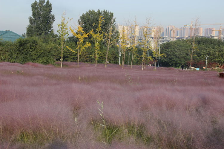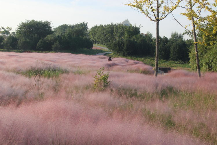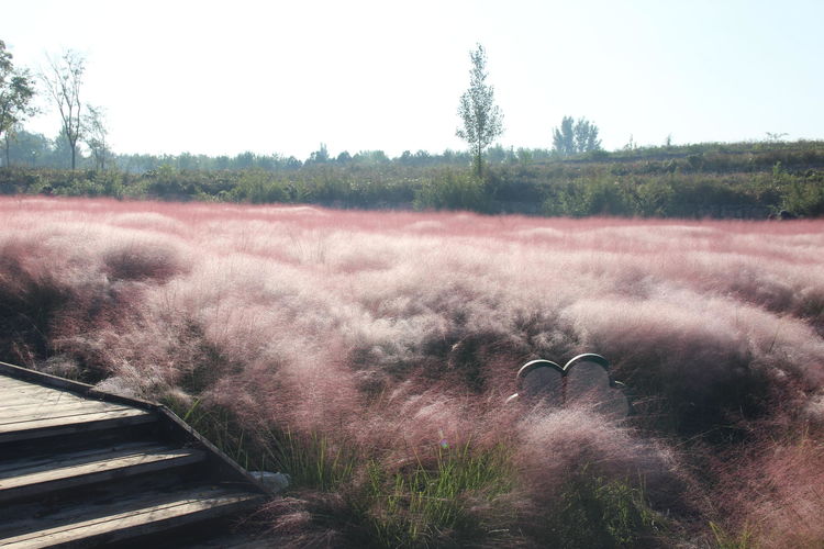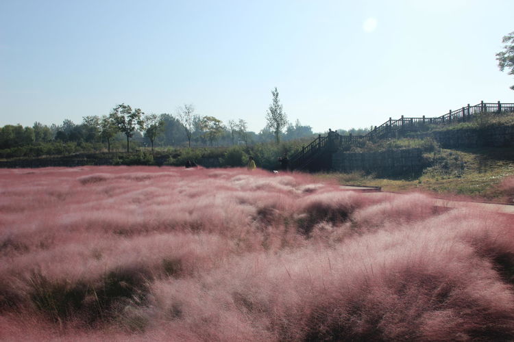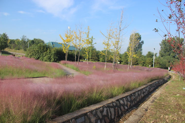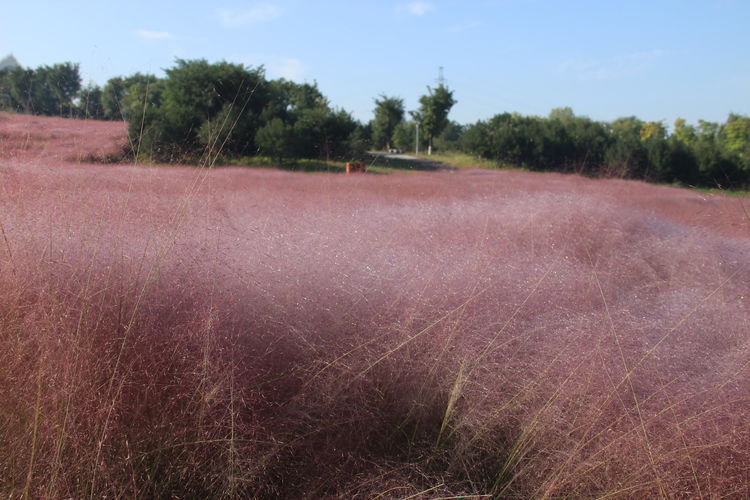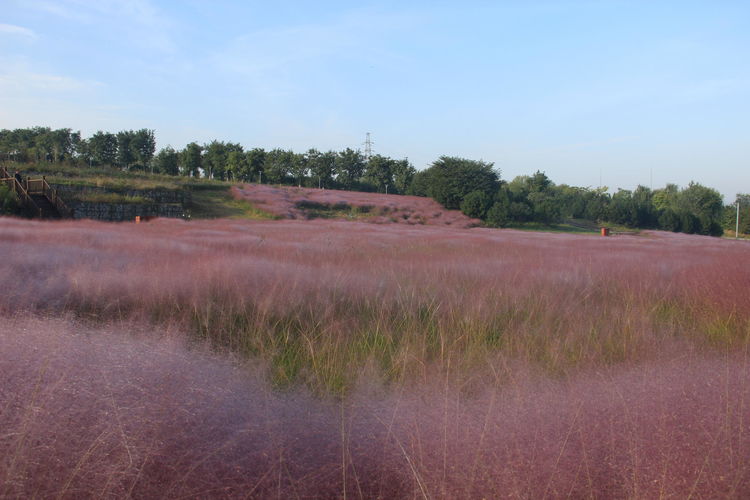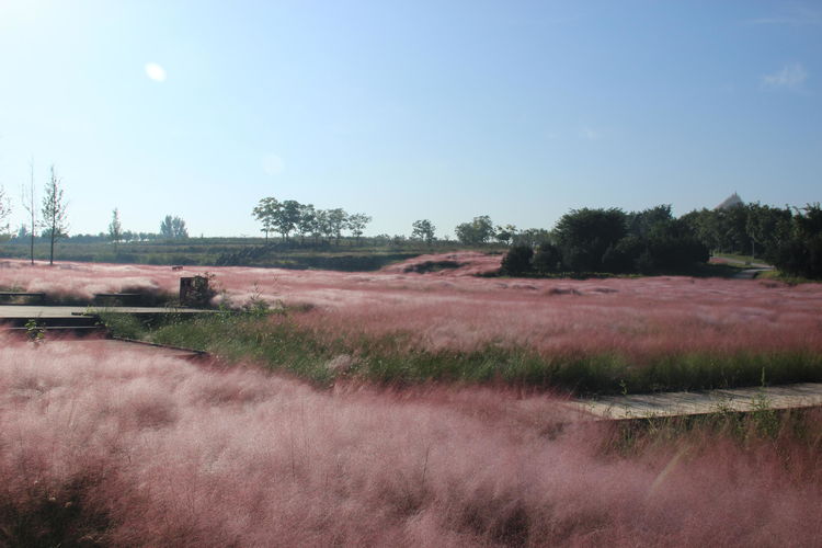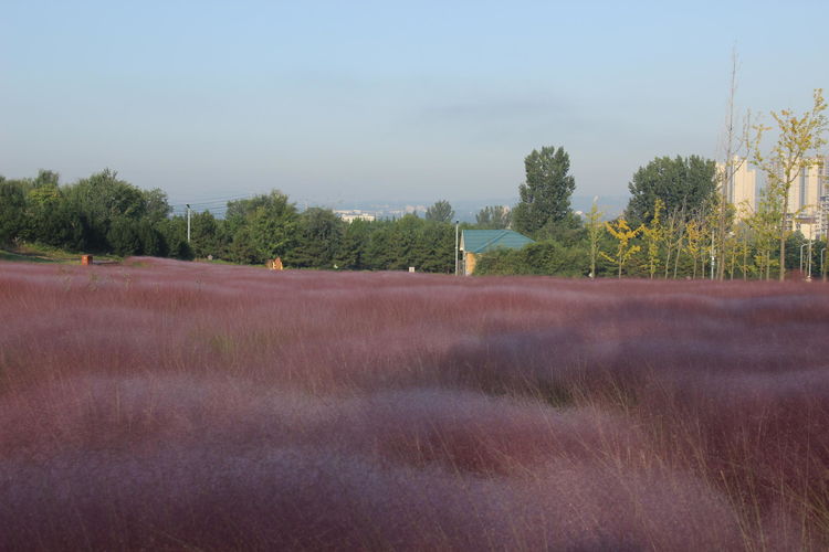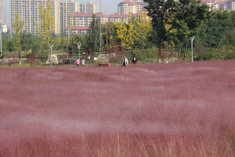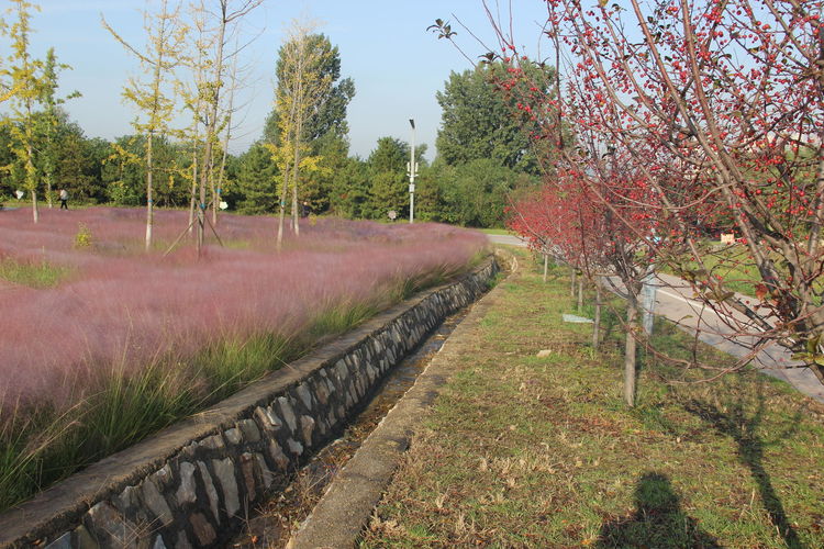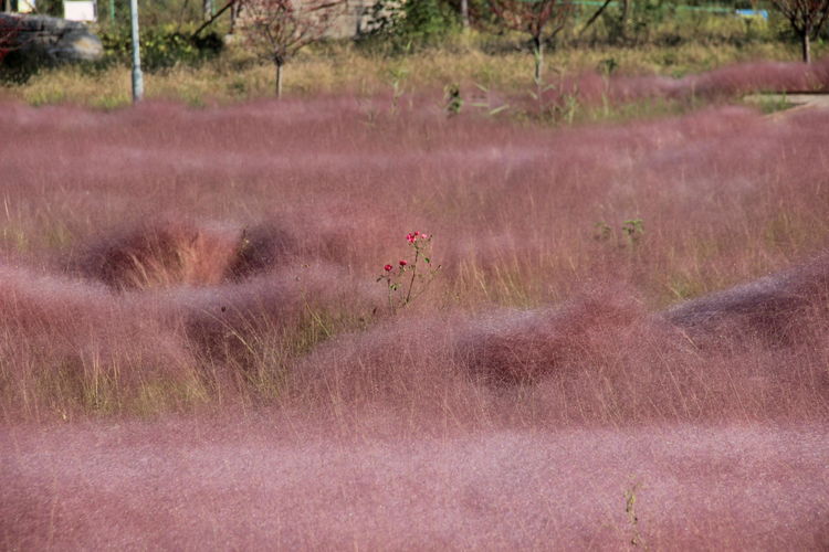 几株苇儿与月季,努力挺直了身躯,直立于红粉世界里,一副不服气的样子。近看,还能看到它们的身形;远观,它们统统都被淹没在粉红色之中。