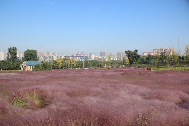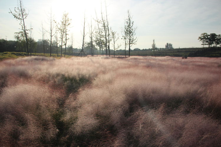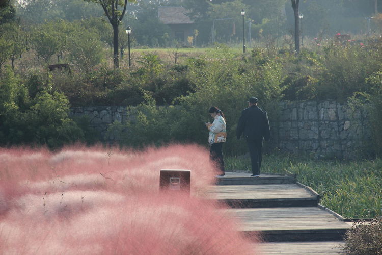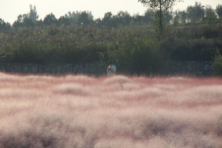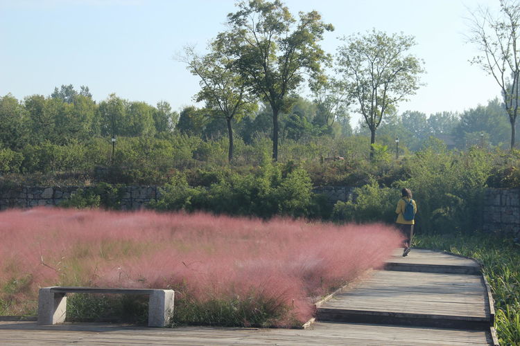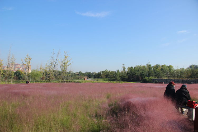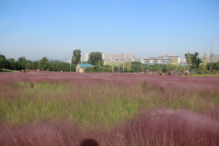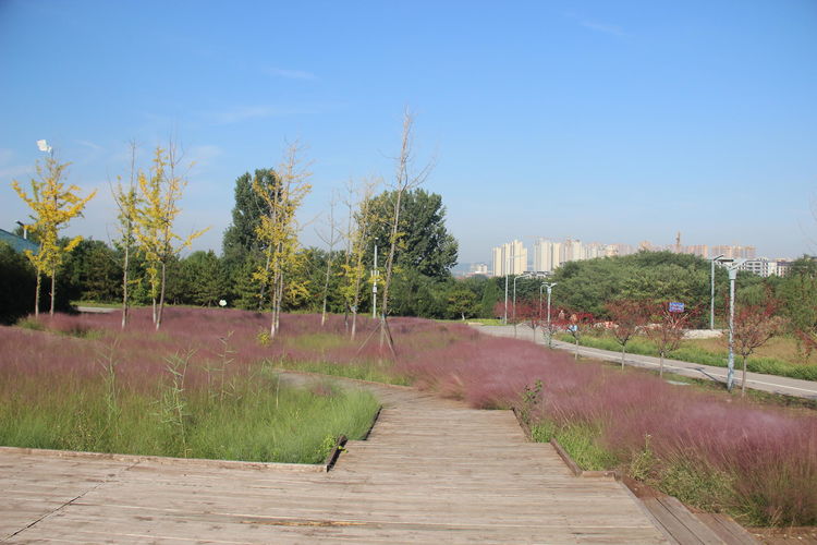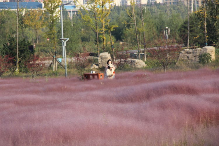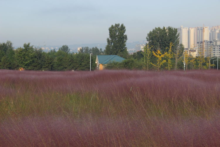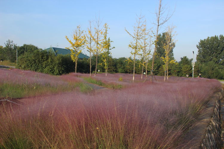 几株苇儿与月季,努力挺直了身躯,直立于红粉世界里,一副不服气的样子。近看,还能看到它们的身形;远观,它们统统都被淹没在粉红色之中。