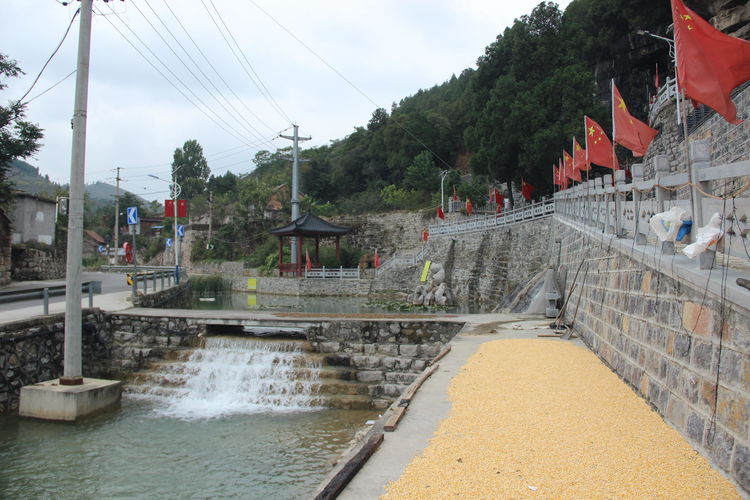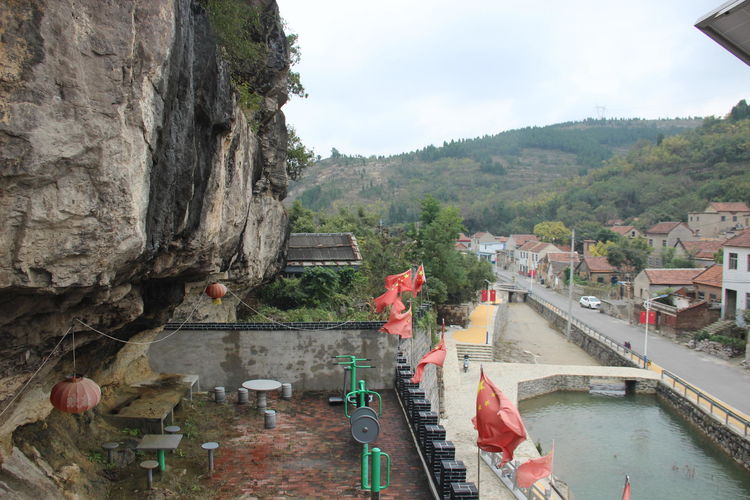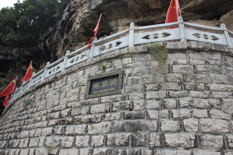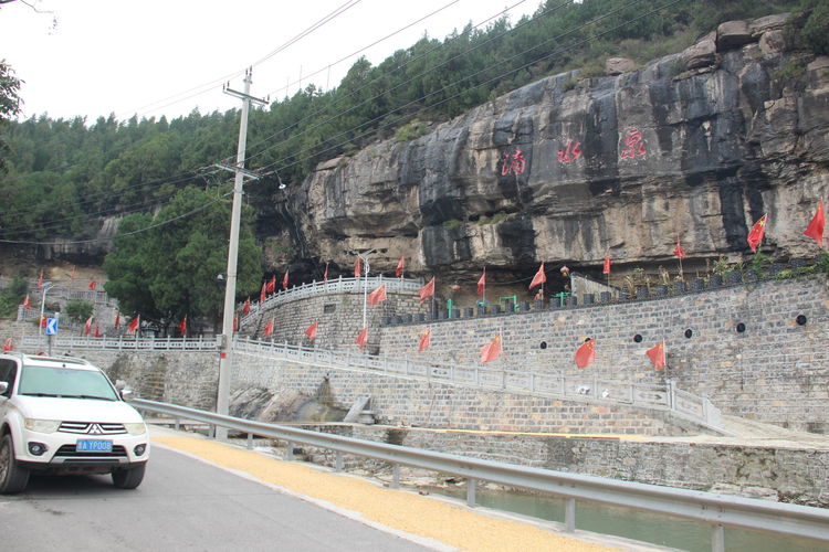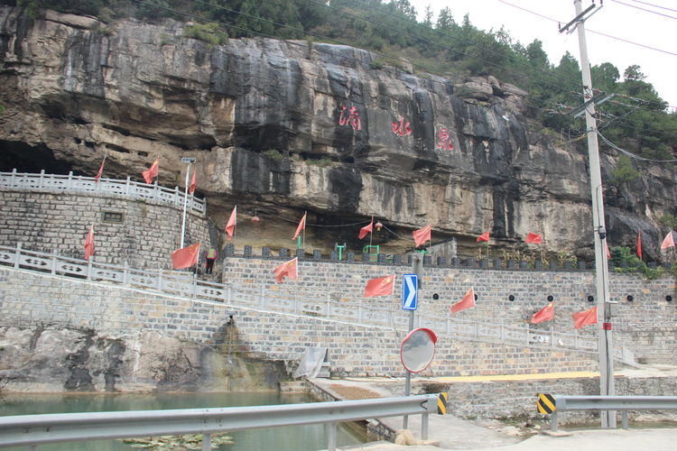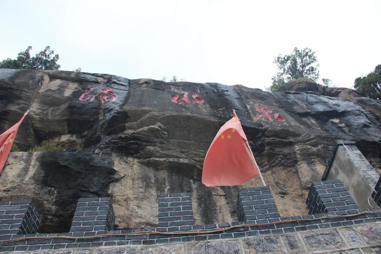 山下,依山而建了几个平台。乍看酷似一座城堡。青石作骨,水泥为缝,线条柔和,姿态优美。顶部装饰有栏杆或者垛口。栏板上雕刻了精美的图案与花纹。国庆节时装饰的红旗迎风飘扬,增添了许多的喜庆与大气。