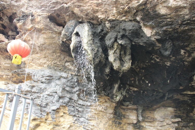 溶洞顶部有着六七处大小不一、形状相似的钟乳石。人为破坏的缘故,没有了平滑的曲线,已经不是完整的乳状了。开裂的扣子,好像在诉说着曾经的苦难经历。但水依然按着自己的习惯和流速泻落着。