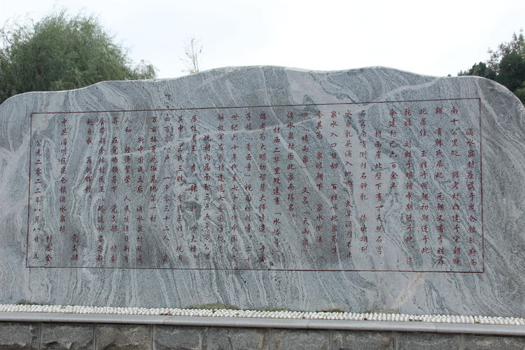 一块巨石上赫然刻着“滴水泉村”四个大字,被油漆涂抹得通红通红。这是村碑。背面书写着村史简历。