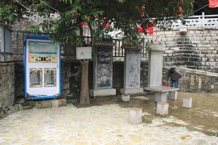 溶洞的最里面有一处小庙,是为“水母庙”。青砖灰瓦,立有石碑。门面的灯笼和对联还很新鲜。这时才看到池边有新立的两块石碑,上面记录着重修的经历与人们捐赠的善款数额。这庙刚刚修缮不几年,怪不得这么新?