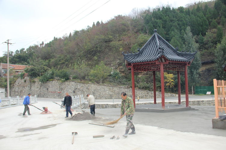 小亭、迎宾墙、长廊……应该是刚刷新过的,鲜亮鲜亮的。几个村人在硬化地面。一座别致的小石拱桥是进村的通道。