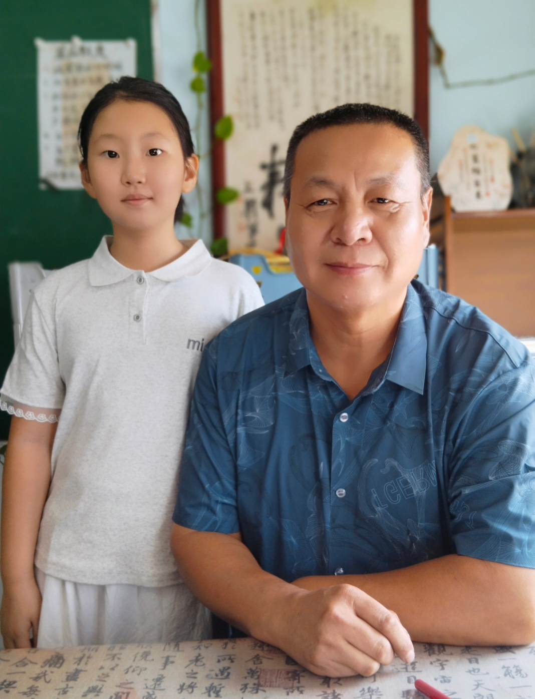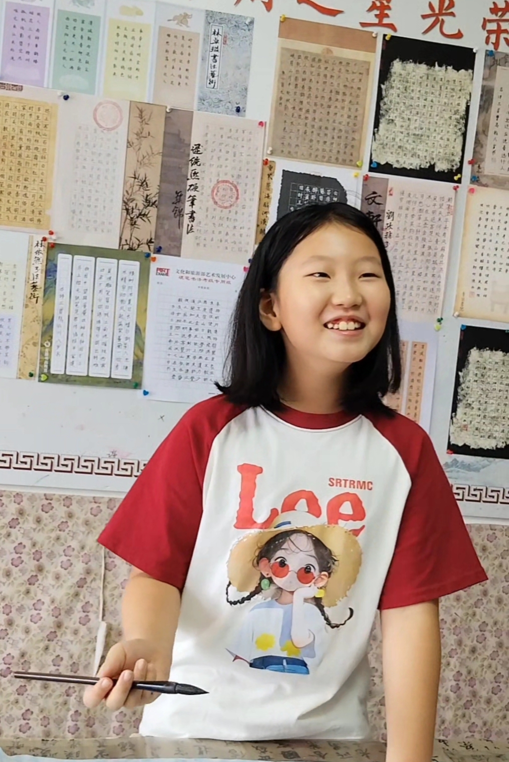 爱笑的她,眼睛里闪的光,每次听我讲书法典故时,忍不住插一句“老师,这个故事我也在哪听过”的哈!偶尔也会闹些小调皮,比如蘸墨时不小心蹭到指尖,她却笑着举起来说“陈老师你看,像不像墨色的小花”,她笑着,开心着,让满室的墨香都多了几分活泼气。