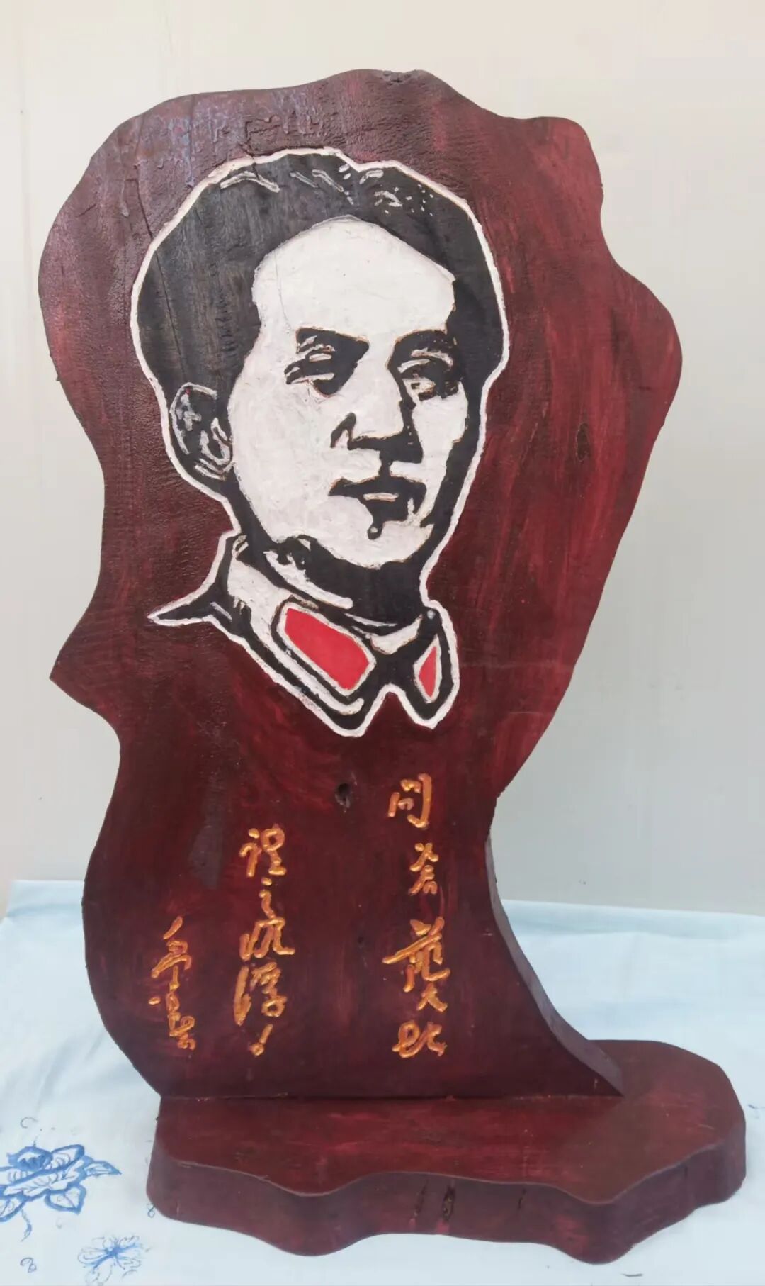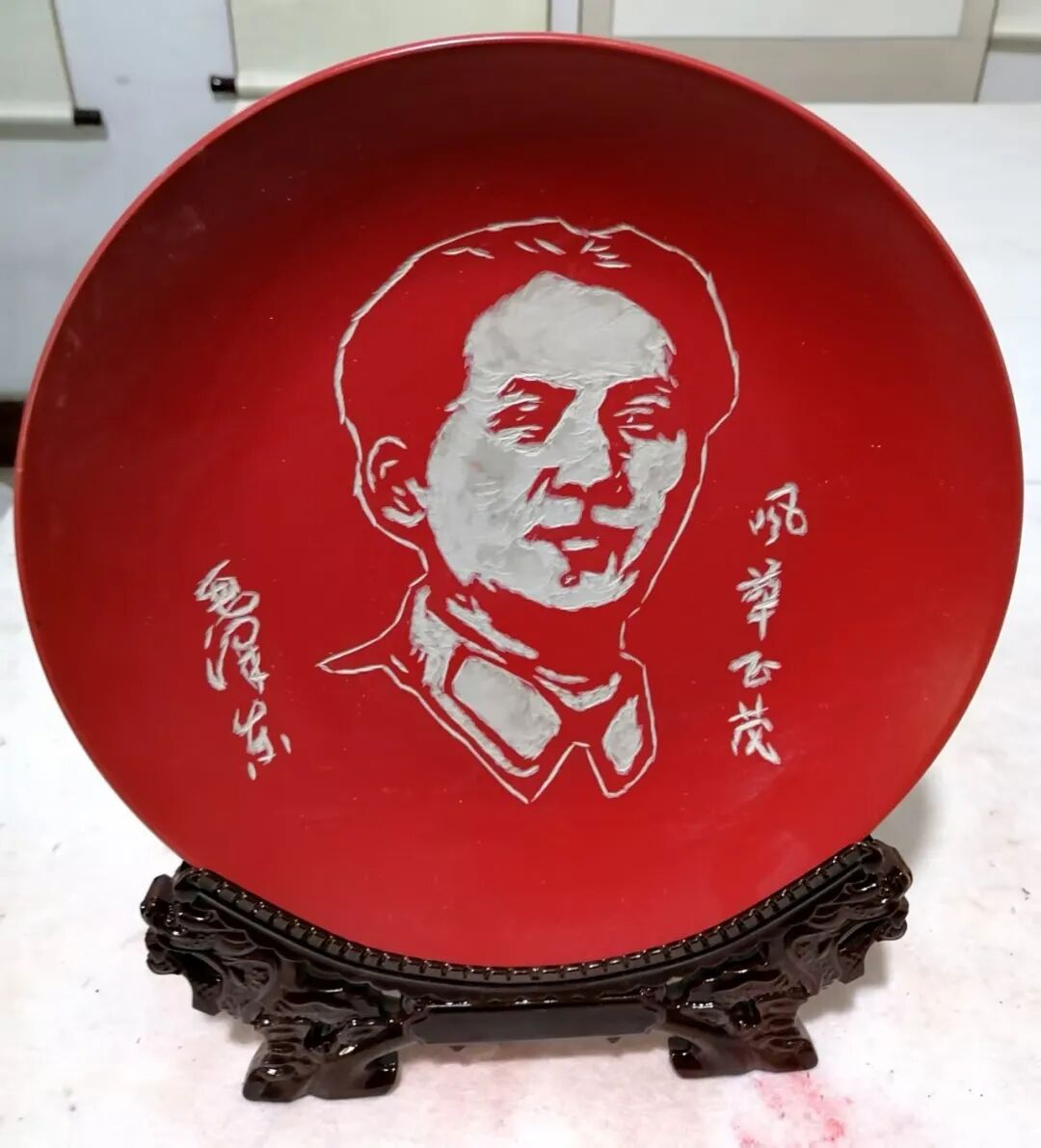 本人书法完美应合了红色题材,并将伟人形象和经典语录皆雕刻于其中,用木雕创作出“伟人头像加精典语录”用瓷盘雕刻毛主席不同时代各种头像。这种以刀代笔,诗与书相结合,书又能与时代相映照,正如艺界常言:“笔墨当随时代”。