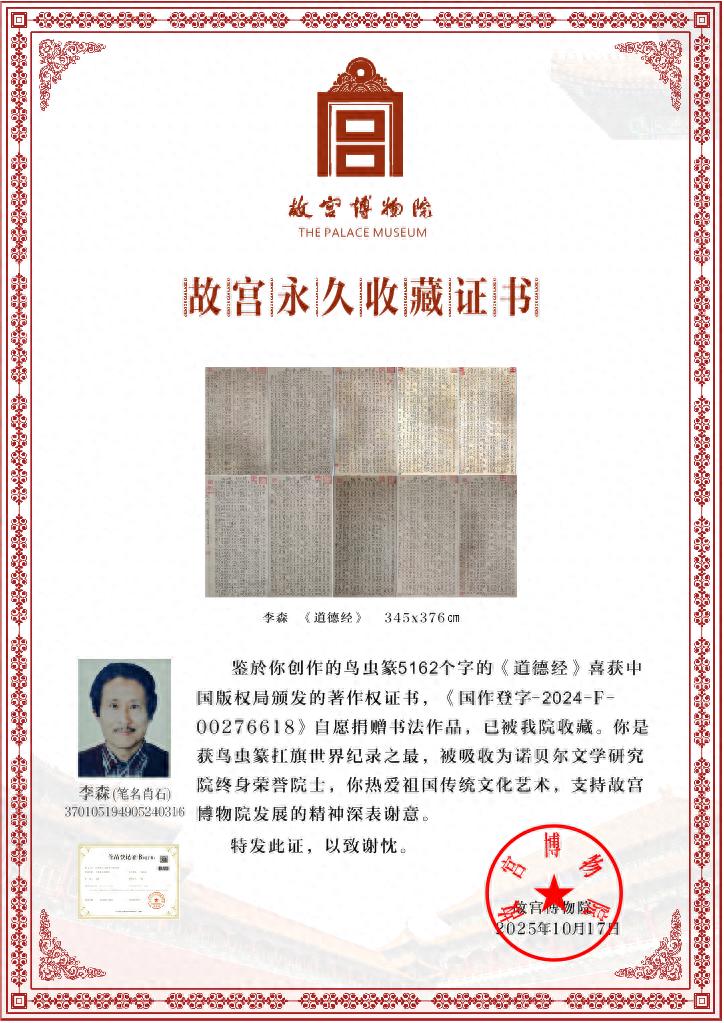 而李森先生完成的,是全文5162字的《道德经》!这项浩大工程,早已让他荣获“鸟虫篆扛旗世界纪录之最”的认证。故宫博物院此次收藏,正是对其艺术价值与历史价值的最高肯定。证书上的国作登记号【国作登字-2024-F-00276618】,为这件艺术品的独创性提供了法律保障。