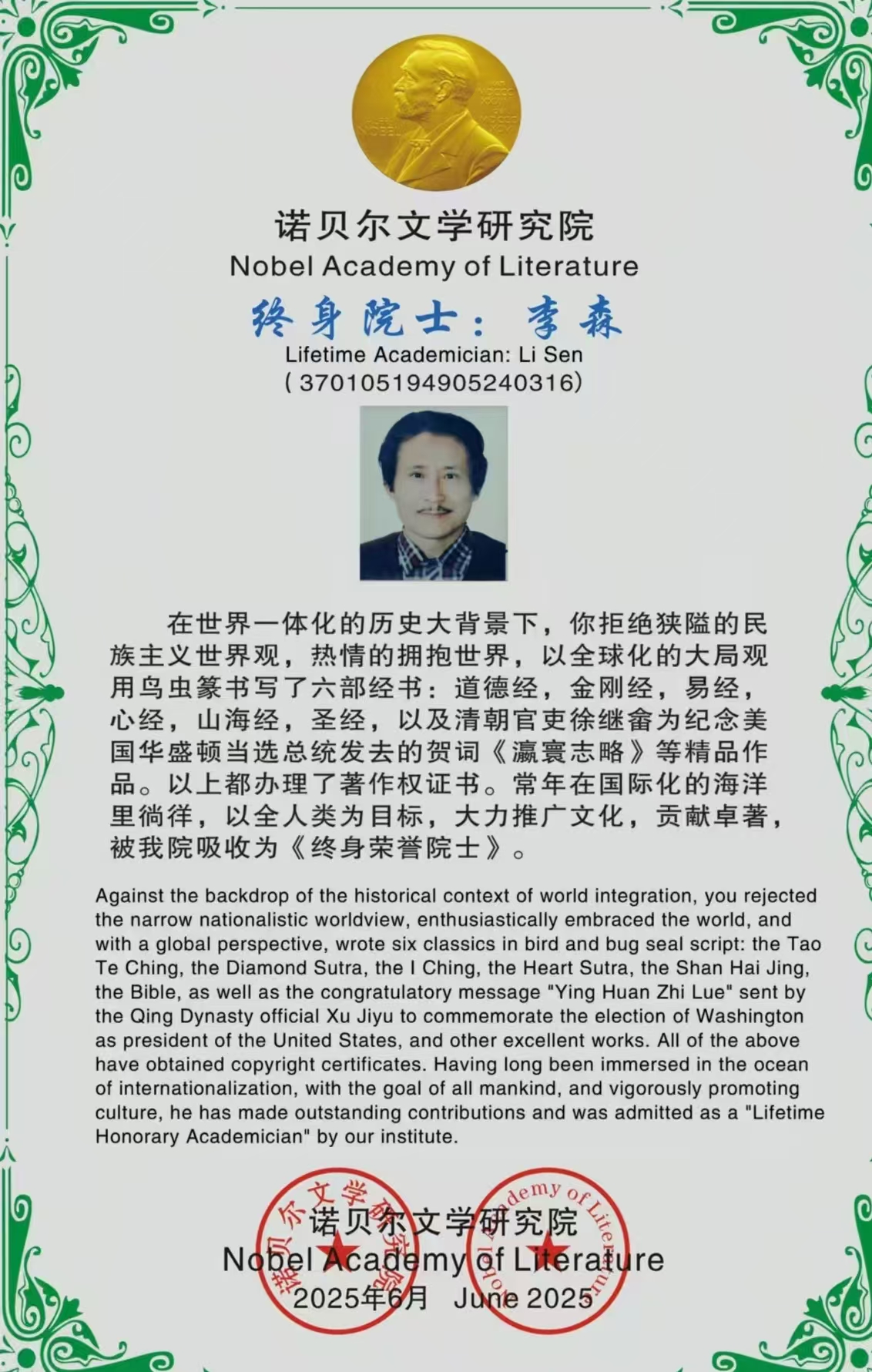 “一开始只是为了把字写‘活’,”李森在采访中回忆道,“但越深入,越感到这不是在写字,而是在与上古先民对话,在刻录一种生命的韵律。” 书写鸟虫篆极耗心神,要求绝对的静定与精准,一天下来,往往只能完成寥寥数字。数千日的孤灯清影,无数次推倒重来,才有了今天这幅笔法精熟、气韵贯通的无价之宝。正因为这份卓越贡献,他也被吸收为“诺贝尔文学研究院”的终身荣誉院士。