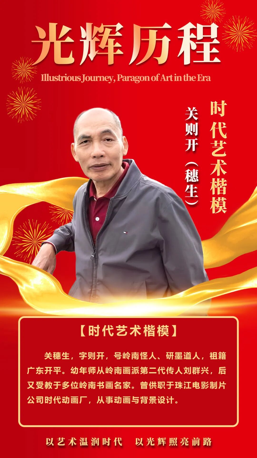 关穗生,字则开,号岭南怪人、研墨道人,祖籍广东开平。幼年师从岭南画派第二代传人刘群兴,后又受教于多位岭南书画名家。曾供职于珠江电影制片公司时代动画厂,从事动画与背景设计。八十年代移居加拿大,创立时代画廊,潜心研习中国焦墨画与隶书,创立“关氏焦墨画”“关氏彩墨山水”,形成独具个人风格的“自然皴法”。现任中加书画交流协会会长。
