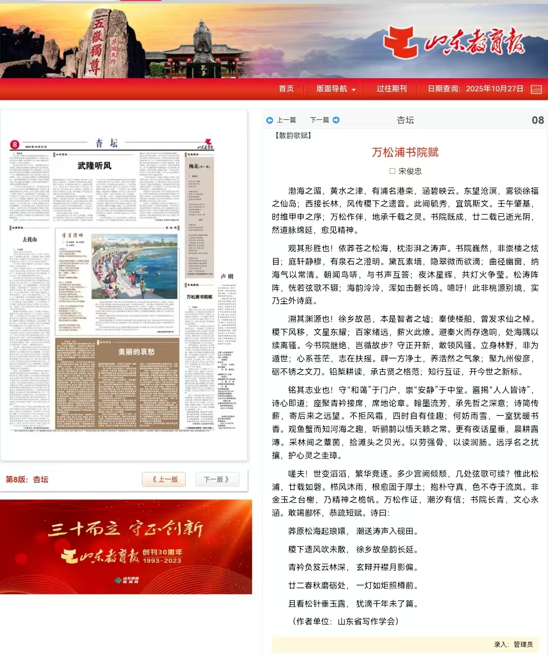 嗟夫!世变滔滔,繁华竞逐。多少宫阙倾颓,几处弦歌可续?惟此松浦,廿载如磐。栉风沐雨,根愈固于厚土;抱朴守真,色不夺于流岚。非金玉之台榭,乃精神之桅帆。万松作证,潮汐有信;书院长青,文心永涵。敢竭鄙怀,恭疏短赋。诗曰: