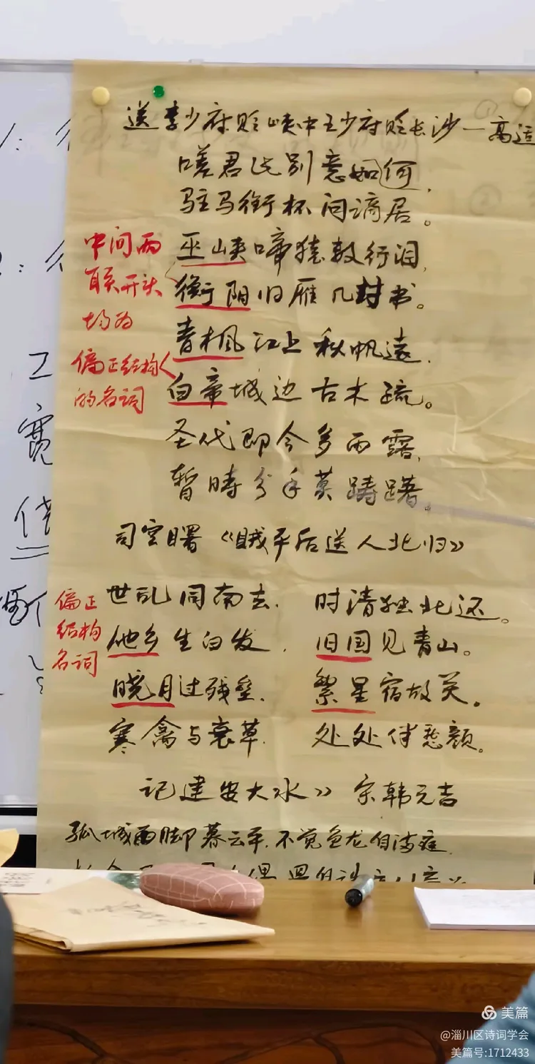 讲堂上,丁老师神采温雅,手指大幅讲义,娓娓而谈,他说,对仗之美,是诗的筋骨;平仄之律,是诗的呼吸。从“工对、宽对、借对”,讲到“偏正、并列、主谓、动宾、动补”——由词性之分及句法之妙,他以诗为经,以律为纬,让古典格律的庄严与灵动,在课堂上焕发新生。每一句讲解,都伴着毛笔的流韵。板上讲义微微泛光,红与黑的对比,如诗的节奏,如音的律动。