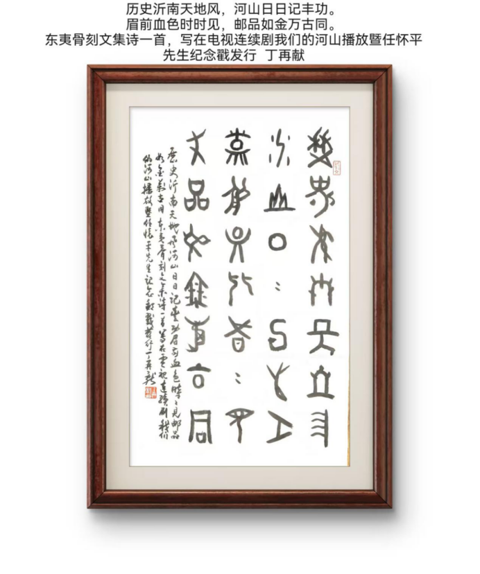 电视连续剧《我们的河山》故事发生在我的家乡沂南,拍摄地也是沂南,纪念邮戳的设计者任怀平先生又是笔者的老友,能不来上集东夷骨刻文字绝句一首是为述评结语?诗曰: