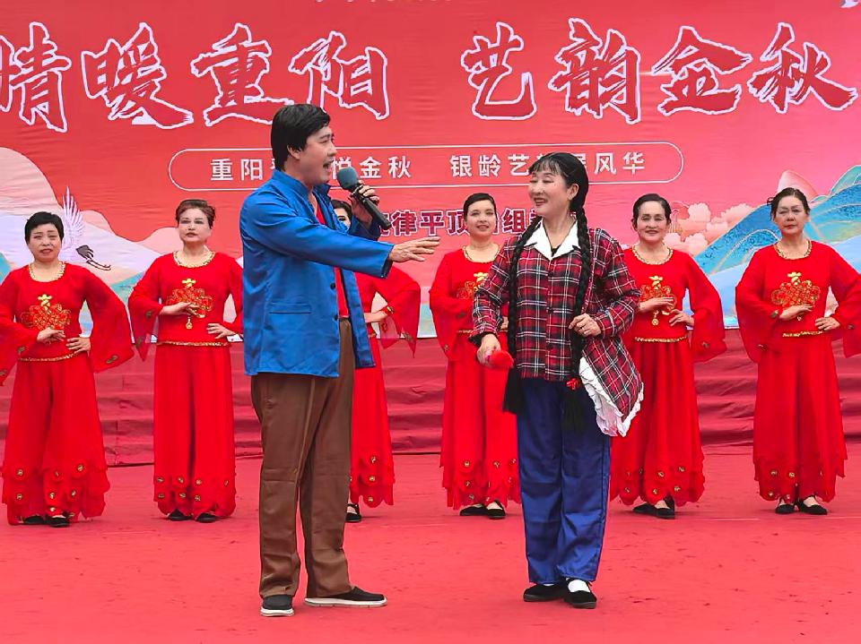 演出间隙,不少老年朋友结伴登高赏秋,在秋日的景致中畅谈生活点滴。
